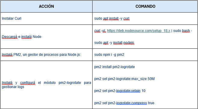Para utilizar Node.js y PM2 en Ubuntu 20.04, es necesario instalar algunas herramientas previas. En esta sección, se detallan los pasos para instalar ''Curl'', descargar e instalar ''Node.js'', añadir ''PM2'' como gestor de procesos y configurar el módulo '/pm2-logrotate para gestionar logs de manera eficiente. Siguiendo estos pasos, se garantiza un entorno estable y funcional para ejecutar aplicaciones basadas en Node.js.