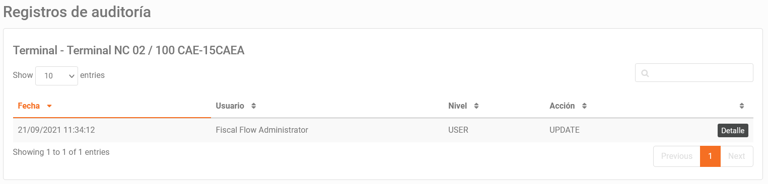 Esta opción permite acceder al listado del histórico de cambios realizados sobre la terminal seleccionada, indicando nombre de usuario, acción y fecha.