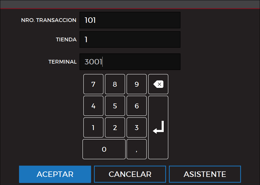 Luego ingresar el Número de Transacción, Tienda y Terminal. Clic en Aceptar.