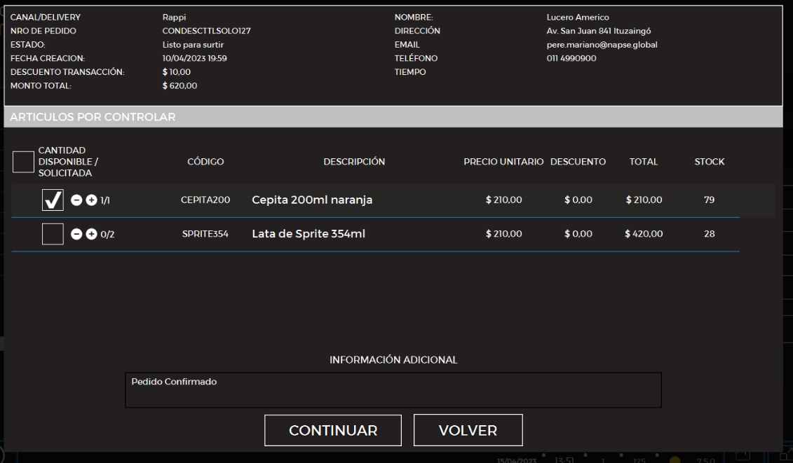 • En el recuadro de Información adicional se pueden informar lo que en el pedido nos llegue como notas aclaratorias (sólo lectura).