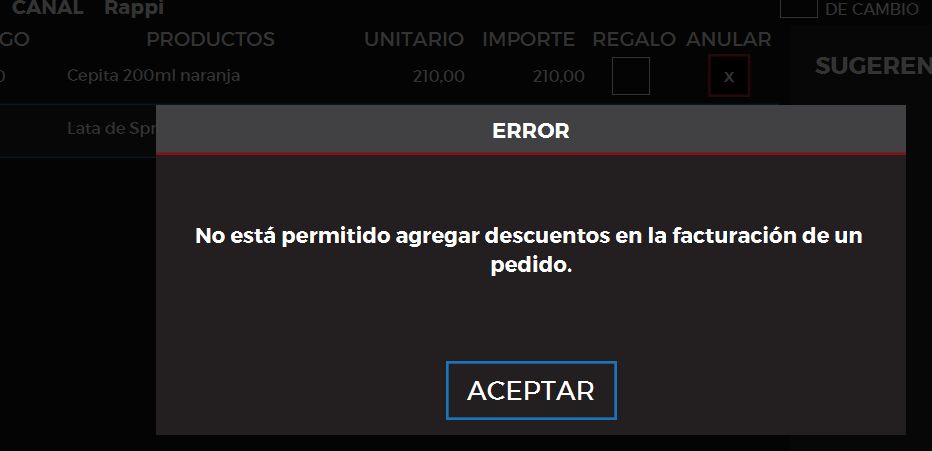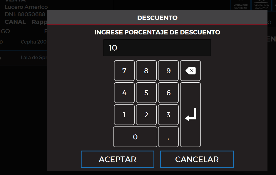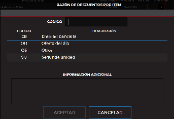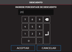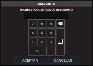 En la parte inferior, el importe en el recuadro titulado Descuentos se muestra en cero, quedando así anulados los descuentos a la transacción. A su derecha se muestra el total a pagar por el cliente ya sin descuentos.
