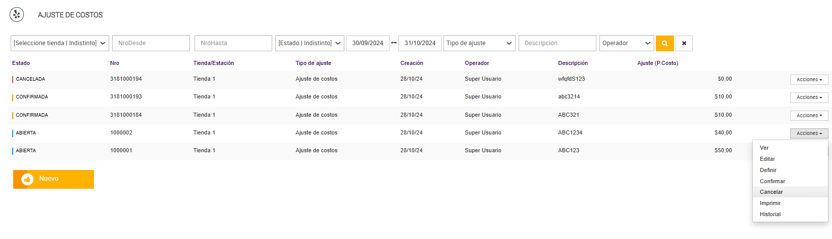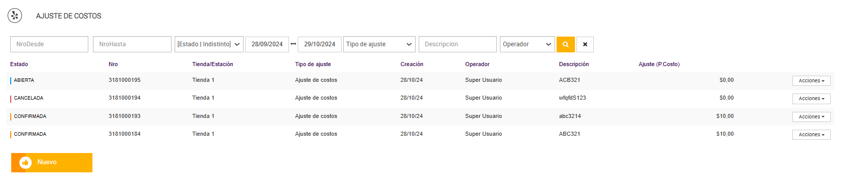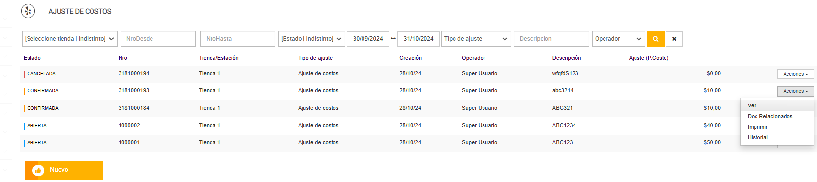 El menú de Acciones disponible para cada ajuste varía en función del estado en el que se encuentre, asegurando que solo las opciones pertinentes se muestren para cada situación específica. Además, los filtros en la parte superior permiten refinar la búsqueda por número de ajuste, estado, tienda, tipo de ajuste, operador, y otros parámetros, facilitando la localización rápida de registros específicos dentro de un rango de fechas definido. Esta funcionalidad optimiza el control y seguimiento de los ajustes de costos en la operación.
