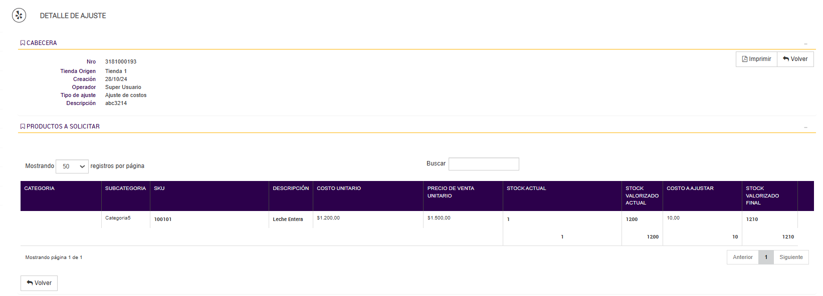 También están disponibles las opciones de Volver para regresar a la pantalla anterior sin aplicar cambios y Imprimir, que permite generar un registro físico o digital del ajuste antes de la confirmación final, útil para documentación o auditoría.