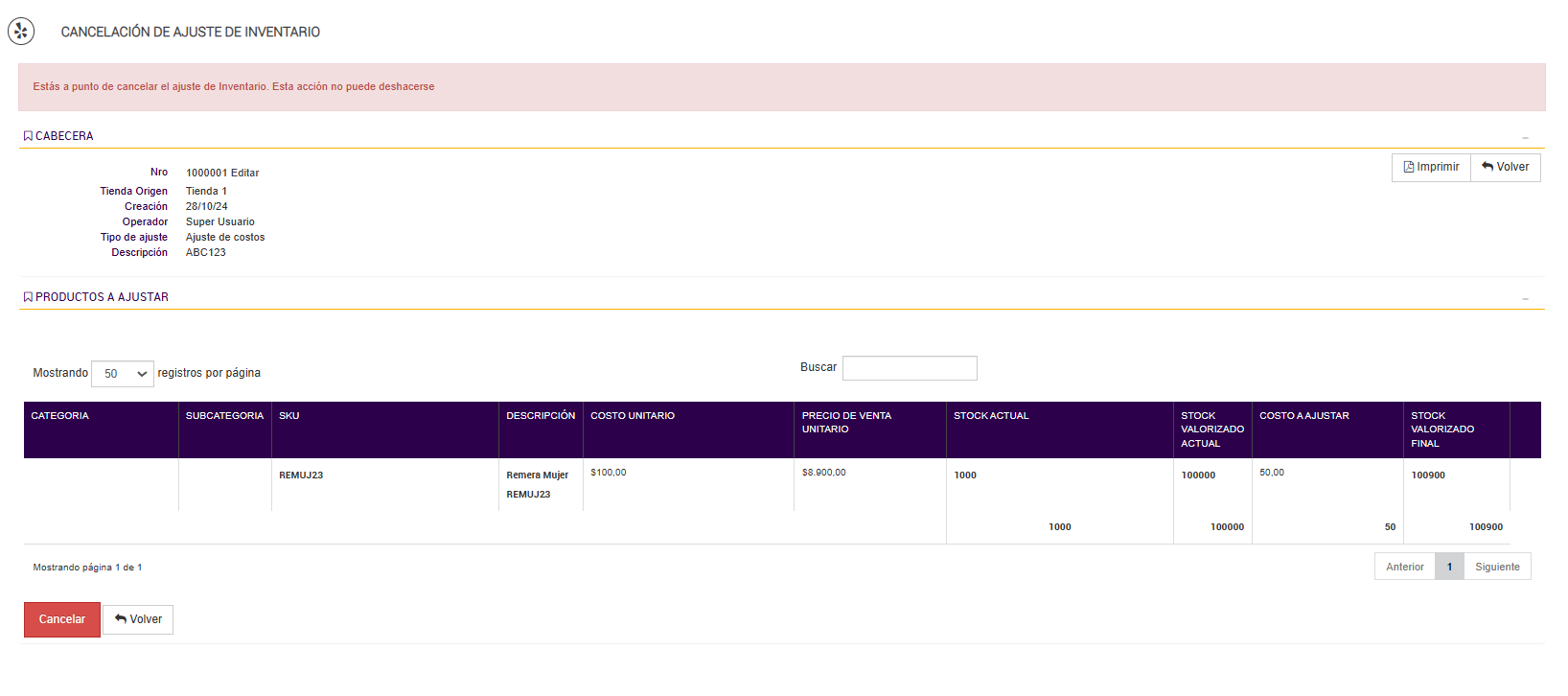 Cabecera: Similar a la pantalla de Detalle de Ajuste, presenta la información del ajuste que se desea cancelar, incluyendo el número de ajuste, tienda de origen, fecha de creación, operador, tipo de ajuste y descripción.