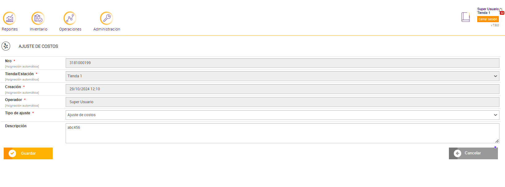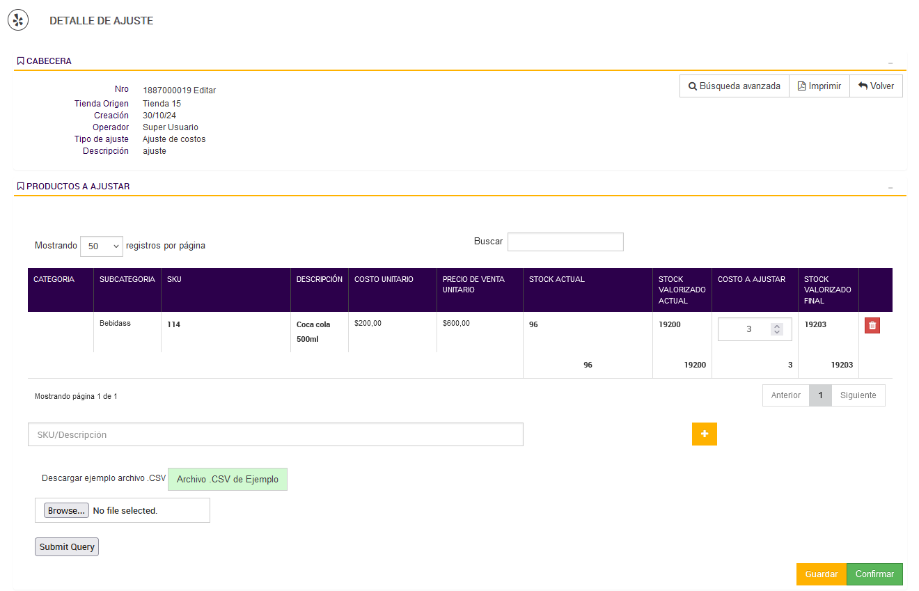 - Operador responsable: Nombre del usuario que realizó el ajuste, útil para fines de auditoría y seguimiento de responsabilidades.