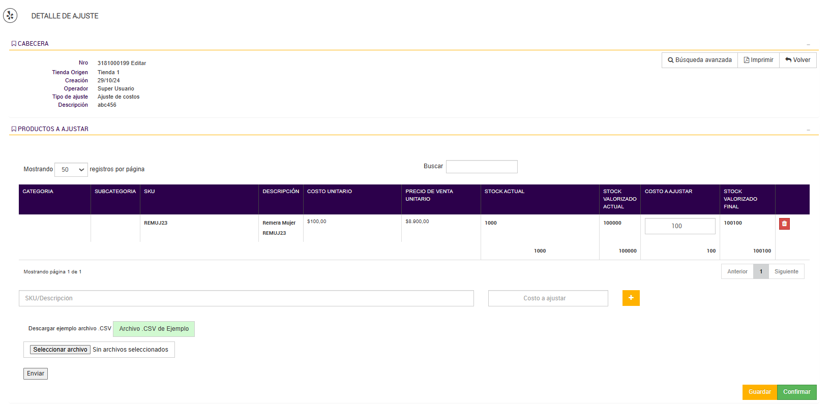 Luego, presionando en guardar, pasa a la pantalla de edición de la orden de ajuste de costos, donde puede revisar y modificar los detalles antes de confirmar el ajuste.