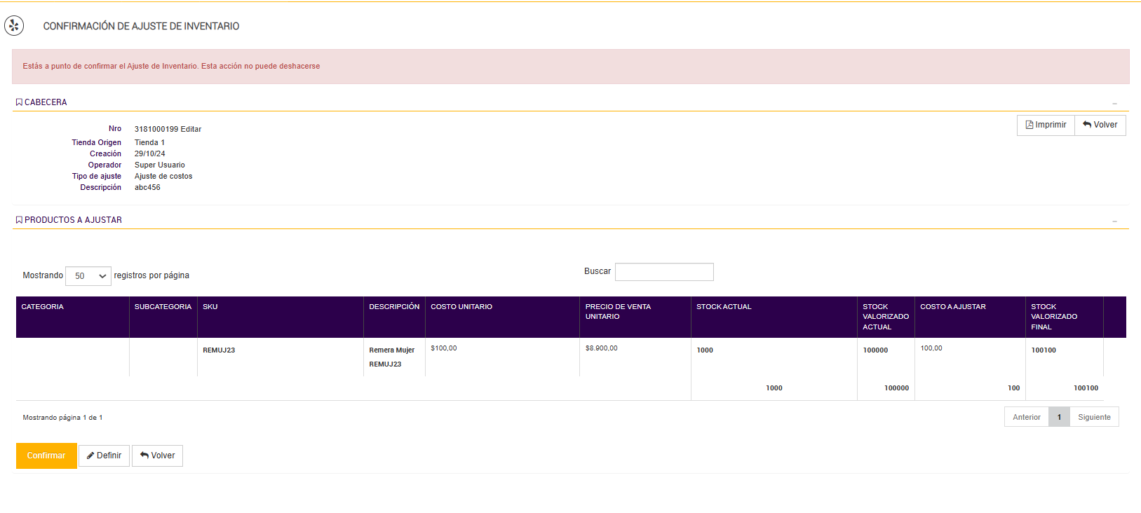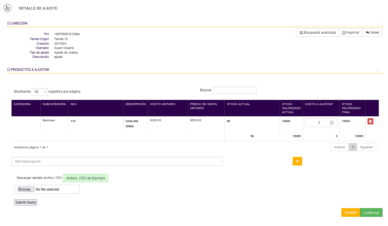 Al completar el ajuste y seleccionar "Confirmar", el sistema realiza los cambios definitivos en el inventario, asegurando que los costos reflejen las modificaciones introducidas por el usuario.