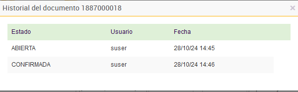 Estado: Indica cada estado por el que ha pasado el ajuste, como "Abierta", "Confirmada" o "Cancelada". Esto permite al usuario comprender en qué momentos y por qué motivos el ajuste fue modificado.