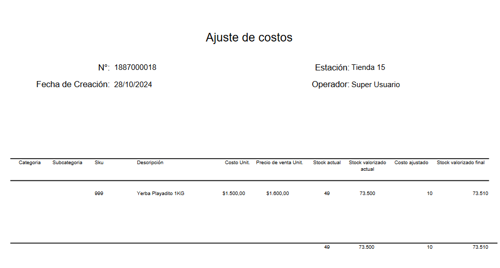 - Stock actual, stock valorizado actual, costo a ajustar y stock valorizado final.