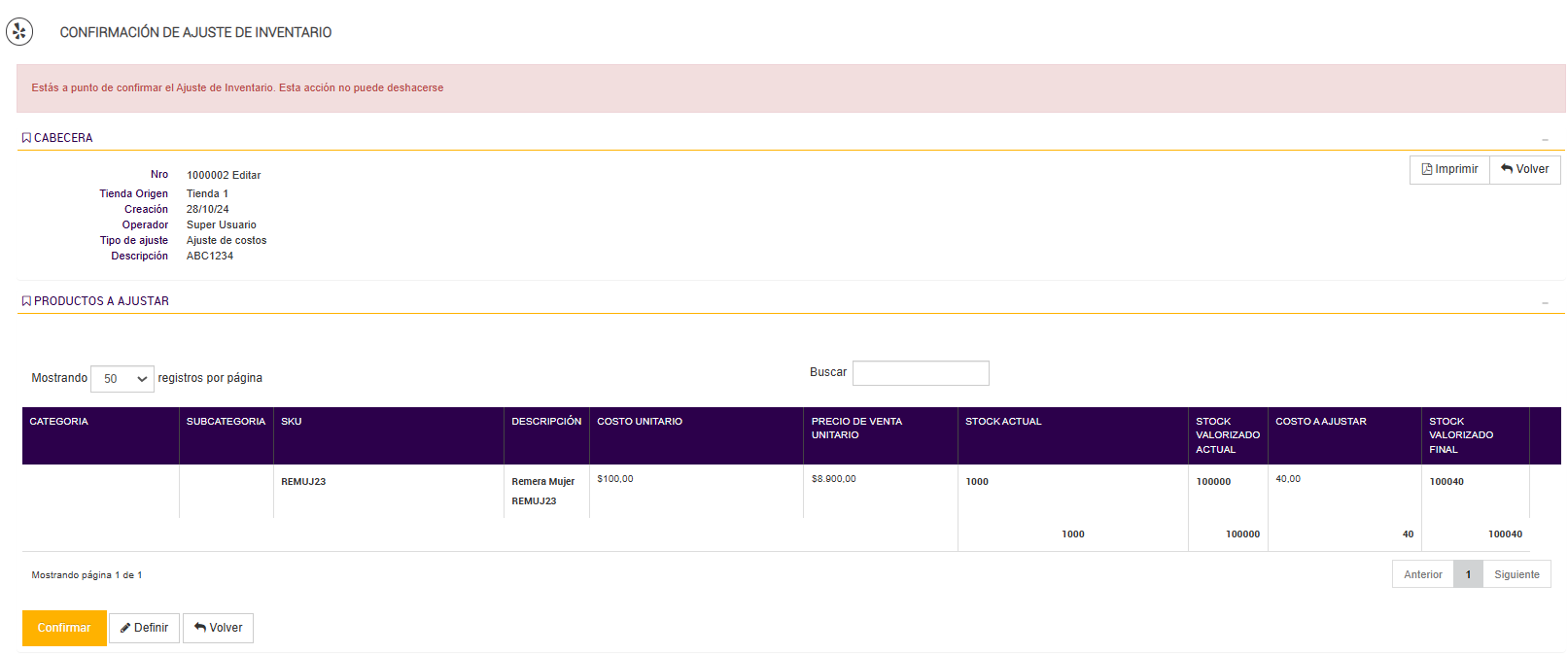 Al Confirmar, el ajuste de costos queda registrado de forma permanente, reflejándose los cambios en el inventario de la tienda. Esta acción implica que el sistema actualiza el stock valorizado y el costo de los productos, cumpliendo así con la operación de ajuste de costos de manera definitiva.