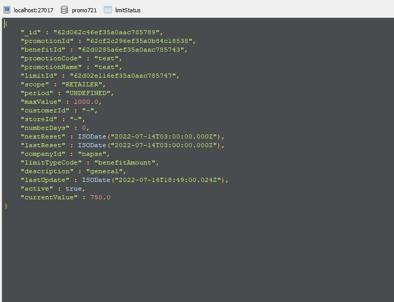 En este ejemplo se ve que se aplica el limite del balance ya que el valor de descuento seria 1500 (value) que es el 15% de 10000, como el beneficio tiene configurado para el balance con código 30 y el customer se envía el tag balances con el código del balance 30 y su saldo de 1000.