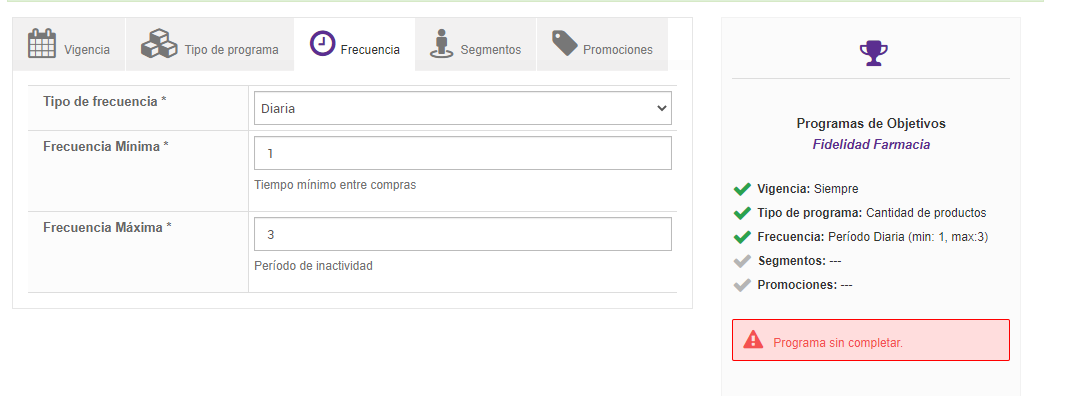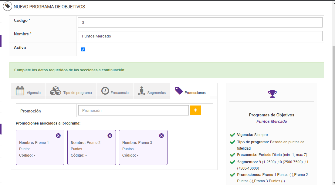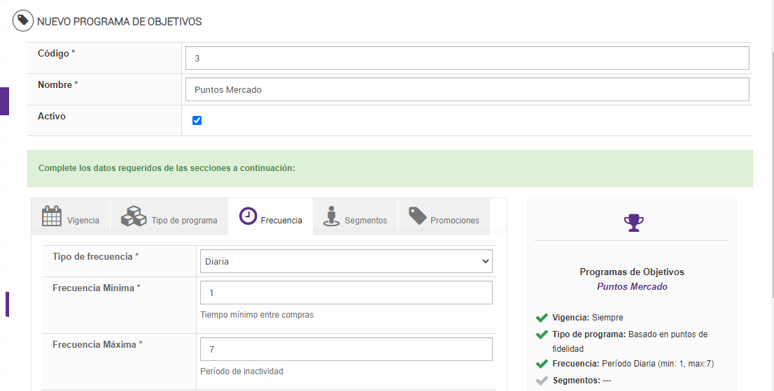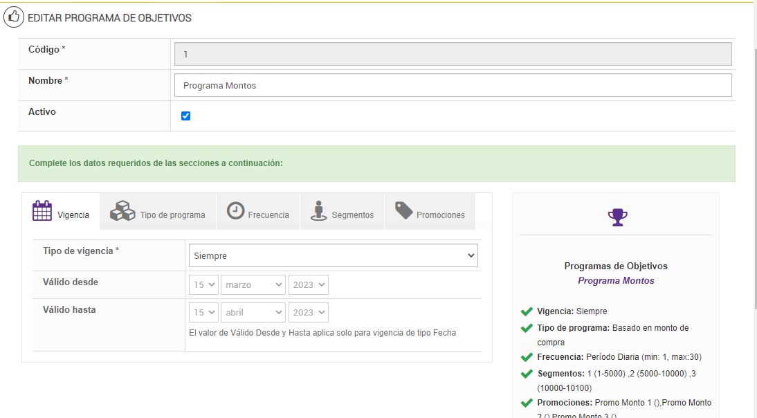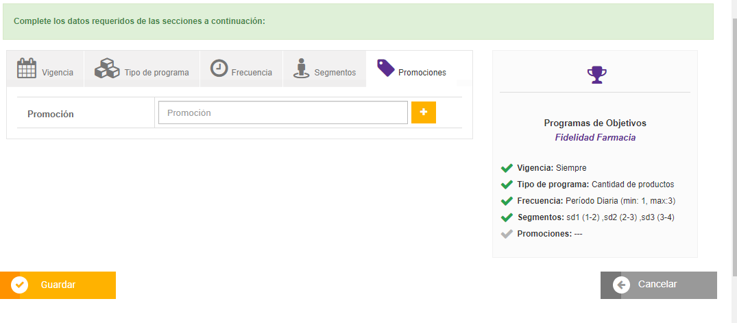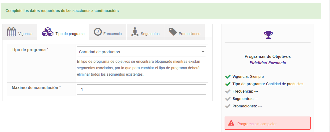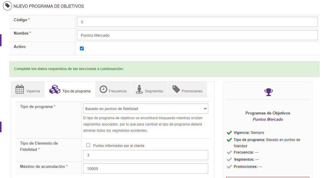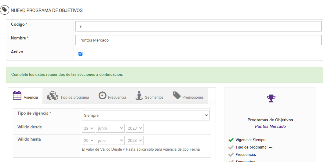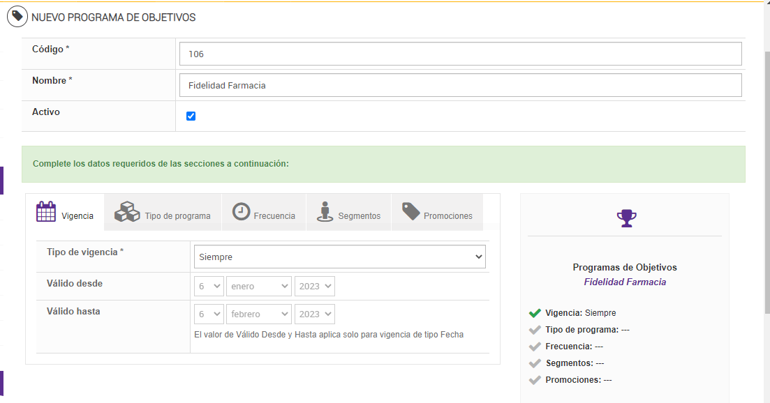 - Para dar de alta un programa de objetivos es obligatorio contemplar las secciones: Vigencia, Tipo de Programa, Frecuencia y Segmento, siendo la sección Promociones un dato opcional.