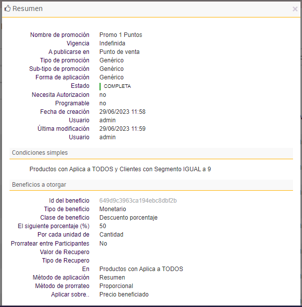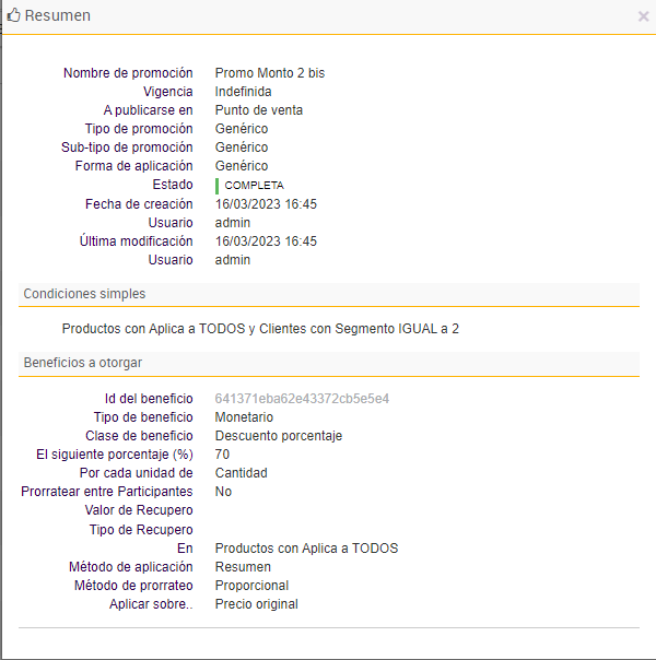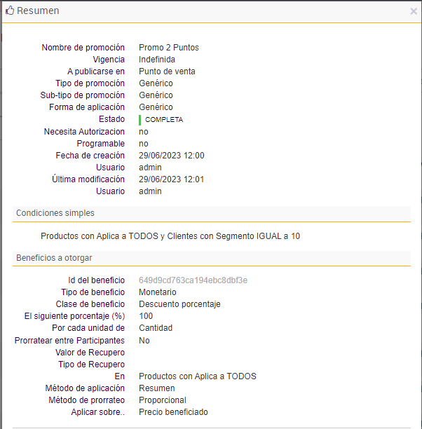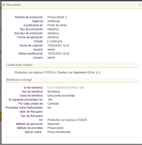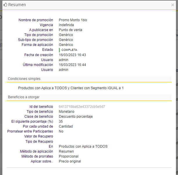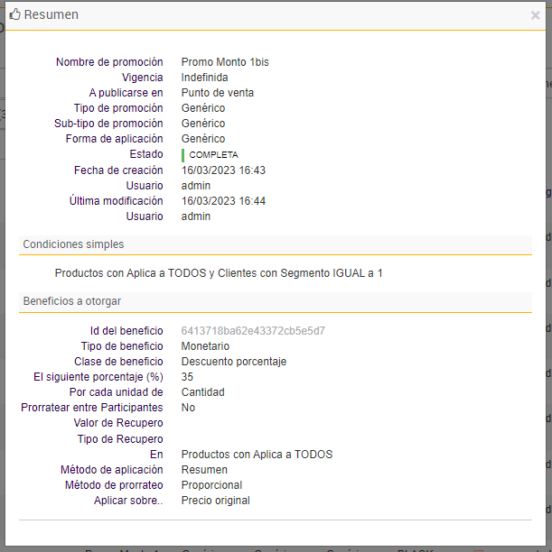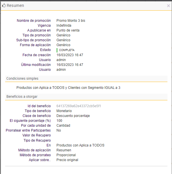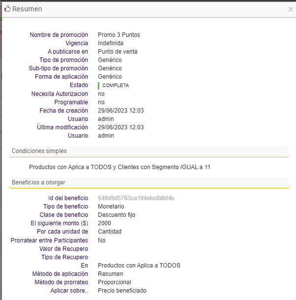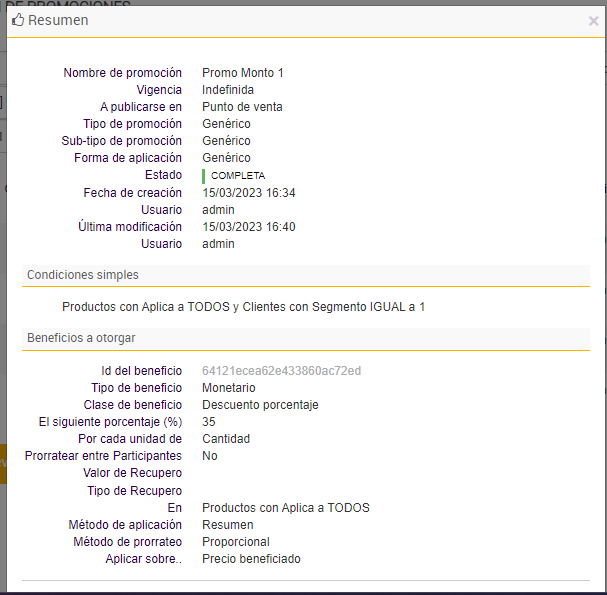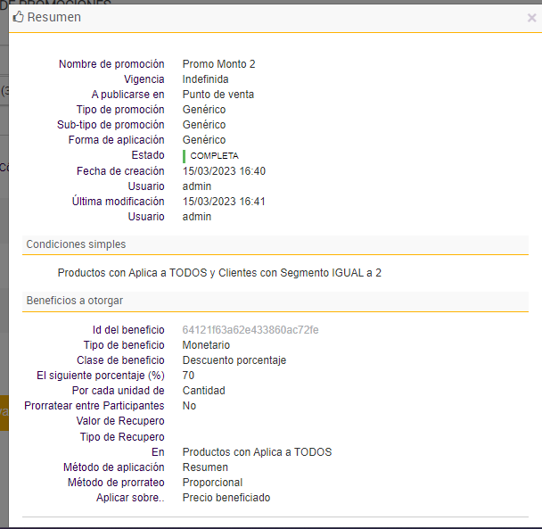 e. Por último se agregan las promociones que darán beneficios a los clientes que formen parte de los segmentos insertados en el paso anterior: