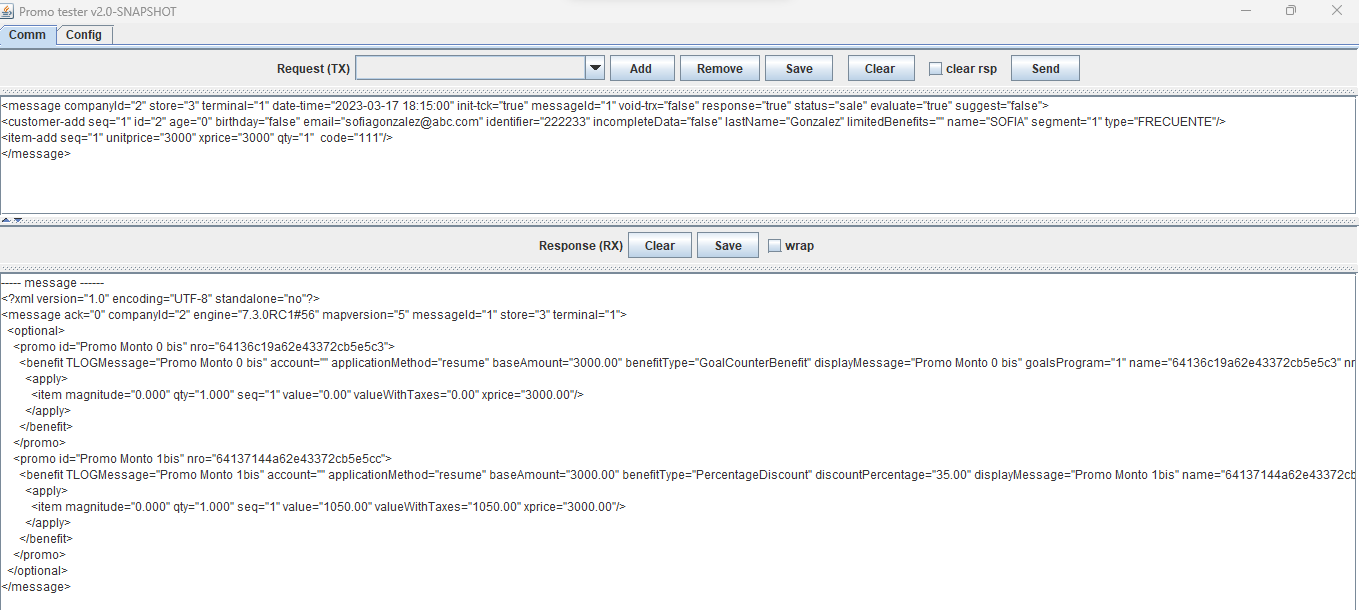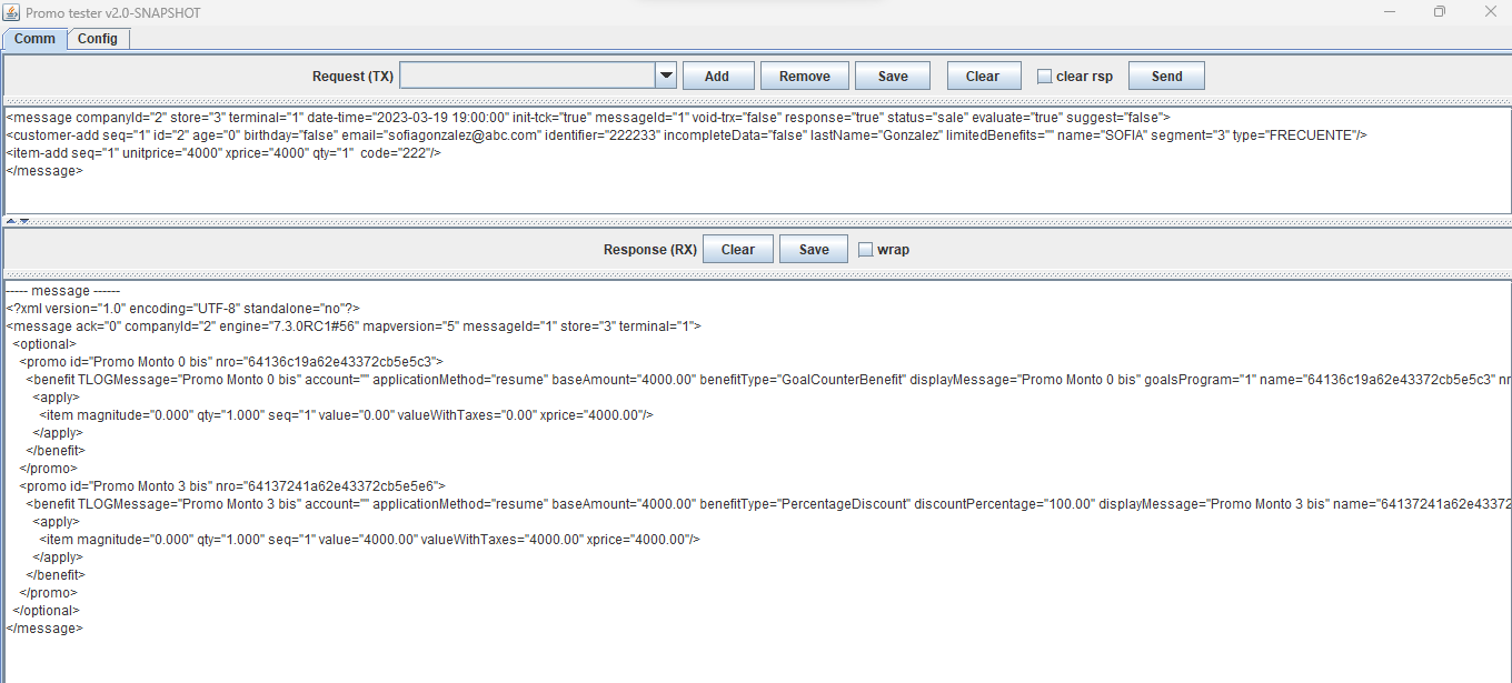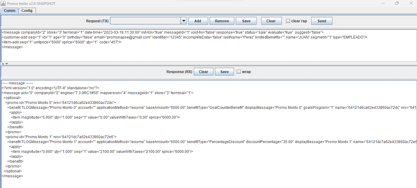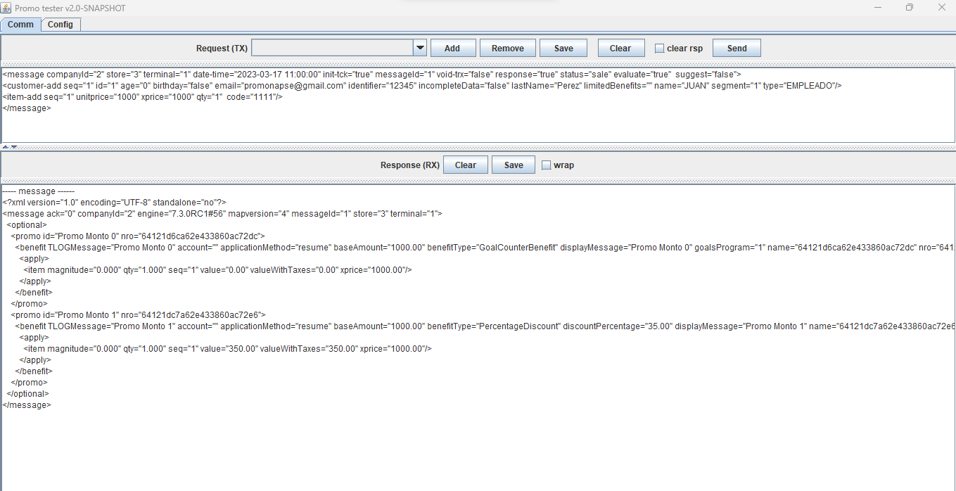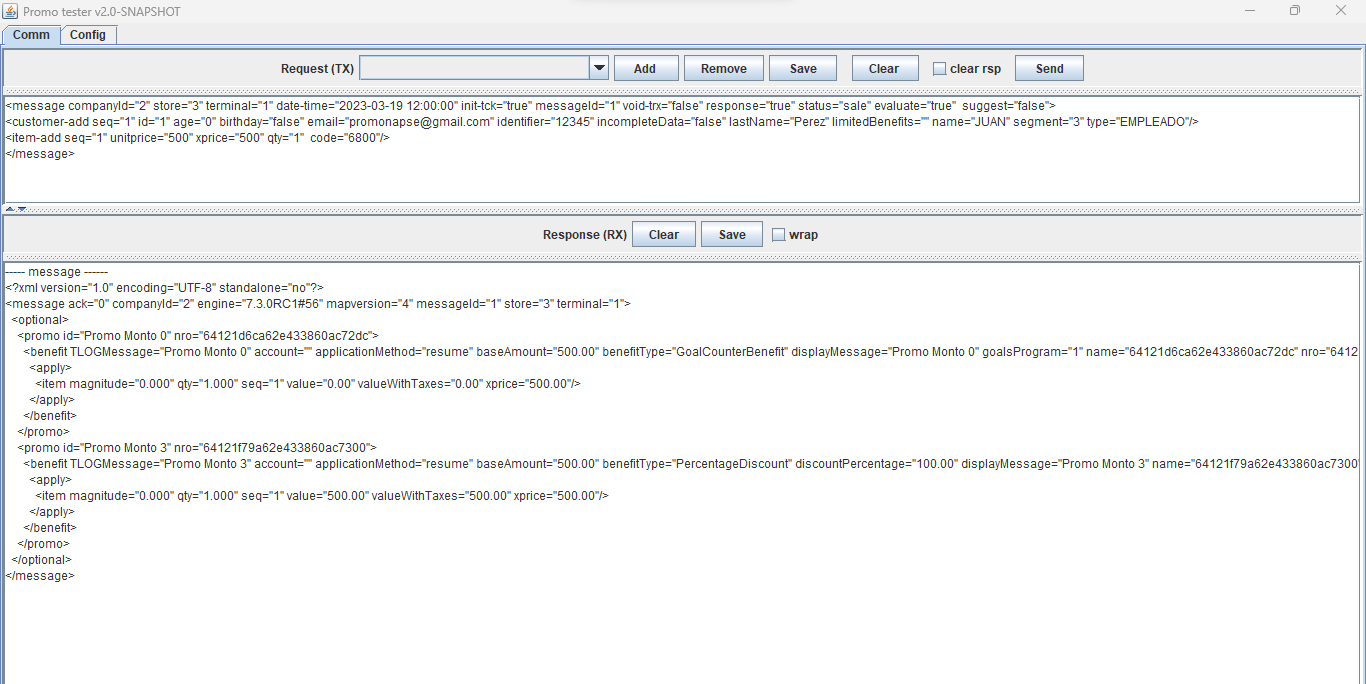 ---- message ------ <?xml version="1.0" encoding="UTF-8" standalone="no"?> <message ack="0" companyId="2" engine="7.3.0RC3#71" mapversion="66" messageId="1" store="3" terminal="1"> <optional> <promo id="Promo 0 Puntos" nro="649d9b4a63ca194ebc8dbf13"> <benefit TLOGMessage="Promo 0 Puntos" account="" applicationMethod="resume" baseAmount="500.00" benefitType="LoyaltyBenefit" displayMessage="Promo 0 Puntos" name="649d9b4a63ca194ebc8dbf13" nro="649d9bae63ca194ebc8dbf1e" order="1" printerMessage="Promo 0 Puntos" totalpoints="100.00" type="3" unit="qty" value="100.00"> <apply> <item magnitude="0.000" points="100.00" qty="1.000" seq="1" value="0.00" valueWithTaxes="0.00" xprice="500.00"/> </apply> </benefit> </promo> <promo id="Promo 3 Puntos" nro="649d9d3163ca194ebc8dbf40"> <benefit TLOGMessage="Promo 3 Puntos" account="" applicationMethod="resume" baseAmount="500.00" benefitType="FixedDiscount" discountAmount="2000.00" displayMessage="Promo 3 Puntos" name="649d9d3163ca194ebc8dbf40" nro="649d9d5763ca194ebc8dbf4b" order="2" printerMessage="Promo 3 Puntos" prorationMethod="PROPORTIONAL" unit="qty"> <apply> <item magnitude="0.000" qty="1.000" seq="1" value="2000.00" valueWithTaxes="2000.00" xprice="500.00"/> </apply> </benefit> </promo> </optional> </message>