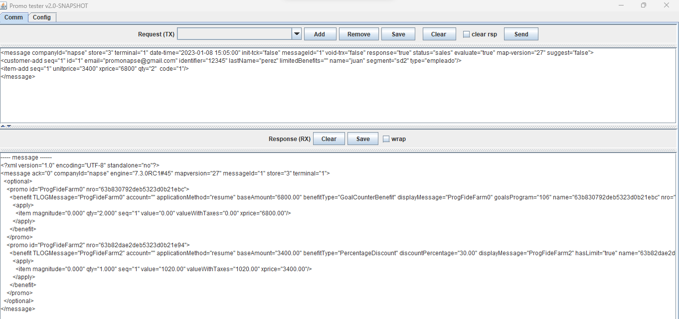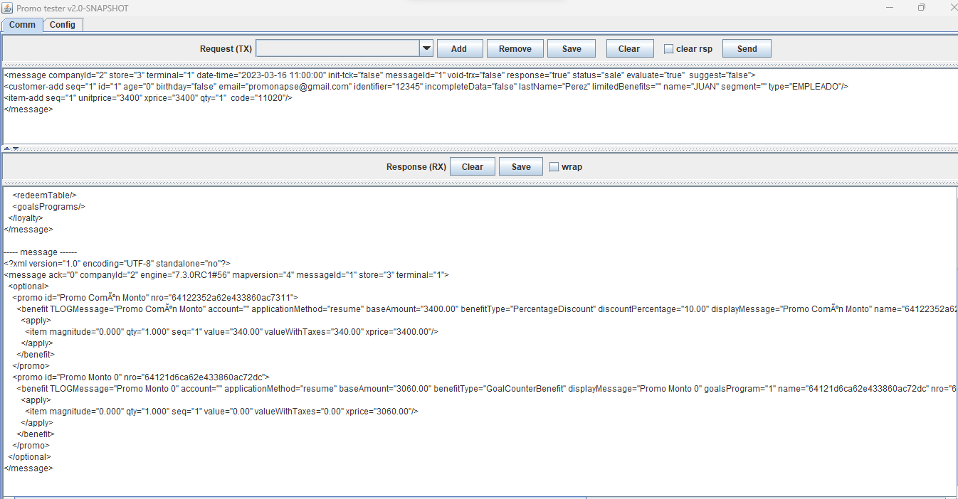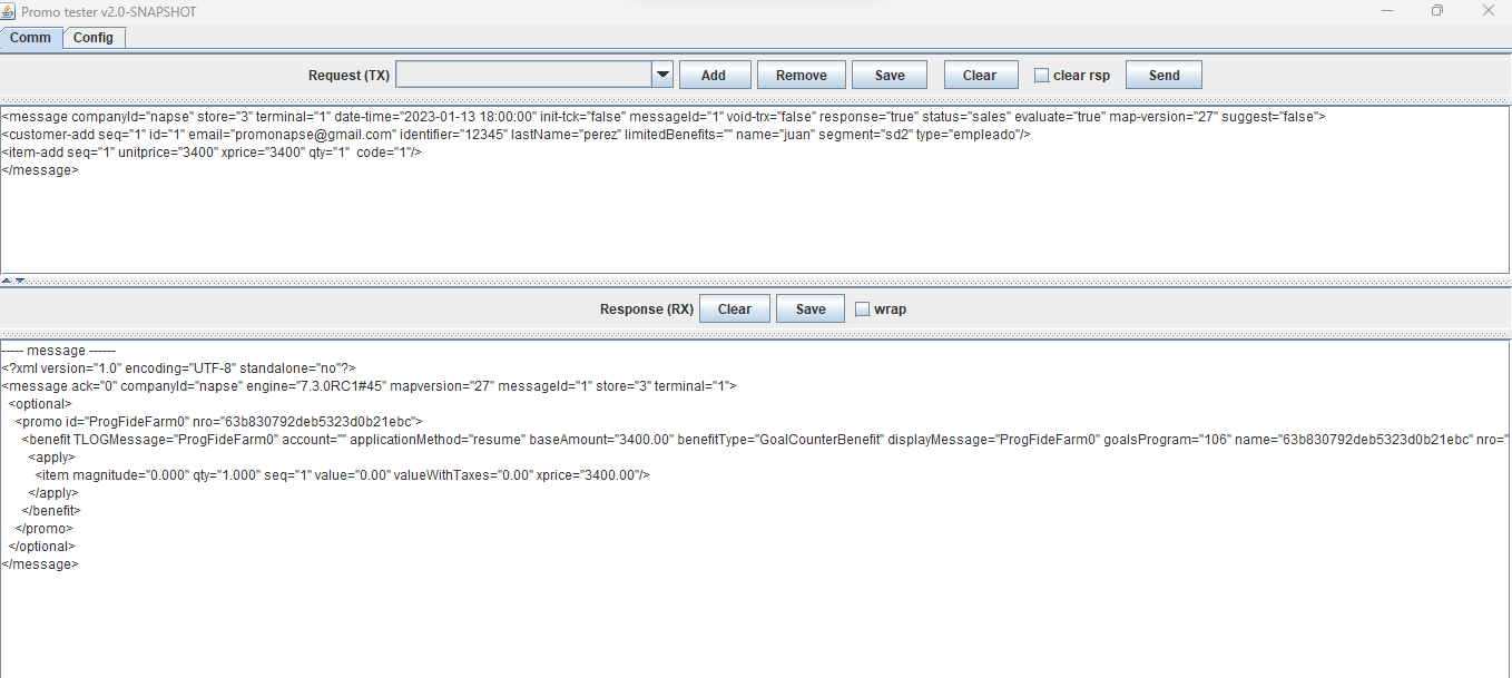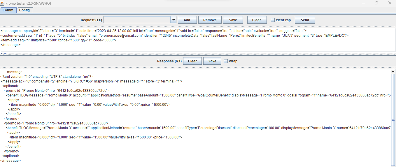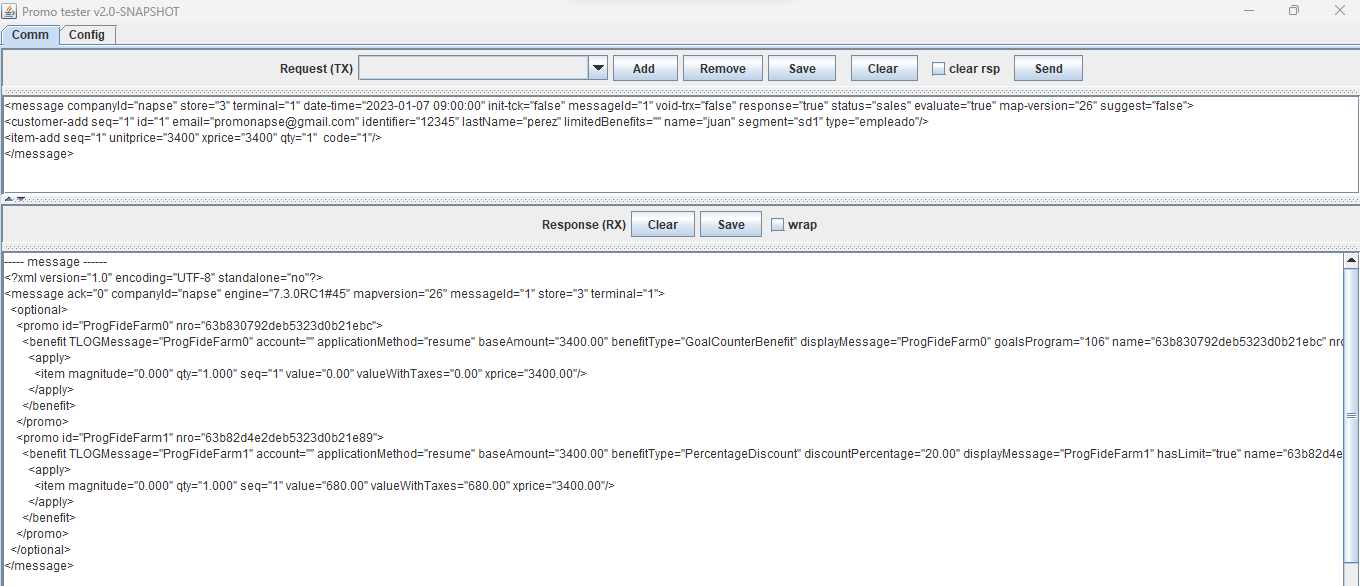 ---- message ------ <?xml version="1.0" encoding="UTF-8" standalone="no"?> <message ack="0" companyId="2" engine="7.3.0RC3#71" mapversion="66" messageId="1" store="3" terminal="1"> <optional> <promo id="Promo 0 Puntos" nro="649d9b4a63ca194ebc8dbf13"> <benefit TLOGMessage="Promo 0 Puntos" account="" applicationMethod="resume" baseAmount="500.00" benefitType="LoyaltyBenefit" displayMessage="Promo 0 Puntos" name="649d9b4a63ca194ebc8dbf13" nro="649d9bae63ca194ebc8dbf1e" order="1" printerMessage="Promo 0 Puntos" totalpoints="100.00" type="3" unit="qty" value="100.00"> <apply> <item magnitude="0.000" points="100.00" qty="1.000" seq="1" value="0.00" valueWithTaxes="0.00" xprice="500.00"/> </apply> </benefit> </promo> <promo id="Promo 3 Puntos" nro="649d9d3163ca194ebc8dbf40"> <benefit TLOGMessage="Promo 3 Puntos" account="" applicationMethod="resume" baseAmount="500.00" benefitType="FixedDiscount" discountAmount="2000.00" displayMessage="Promo 3 Puntos" name="649d9d3163ca194ebc8dbf40" nro="649d9d5763ca194ebc8dbf4b" order="2" printerMessage="Promo 3 Puntos" prorationMethod="PROPORTIONAL" unit="qty"> <apply> <item magnitude="0.000" qty="1.000" seq="1" value="2000.00" valueWithTaxes="2000.00" xprice="500.00"/> </apply> </benefit> </promo> </optional> </message>