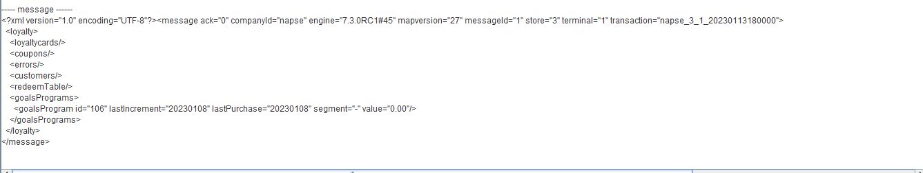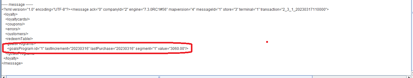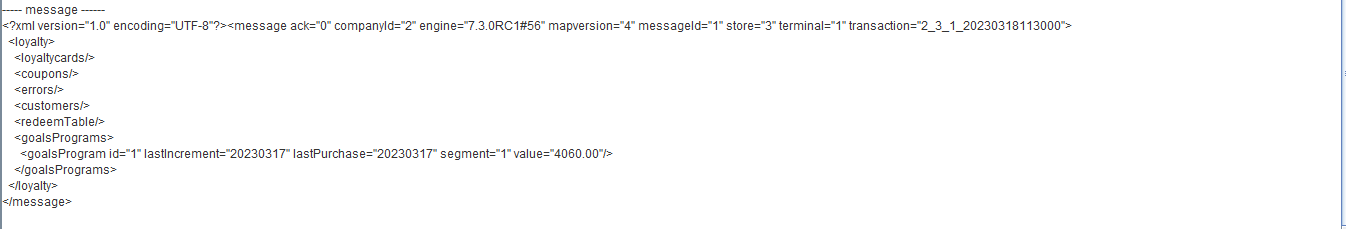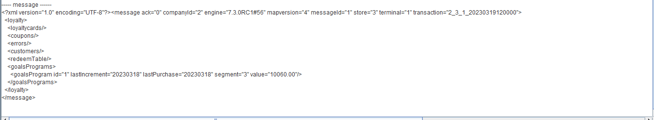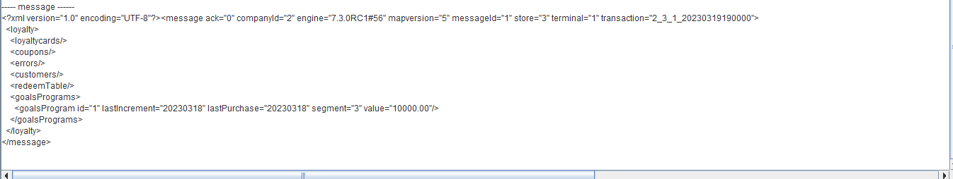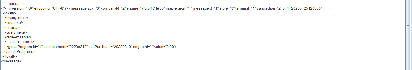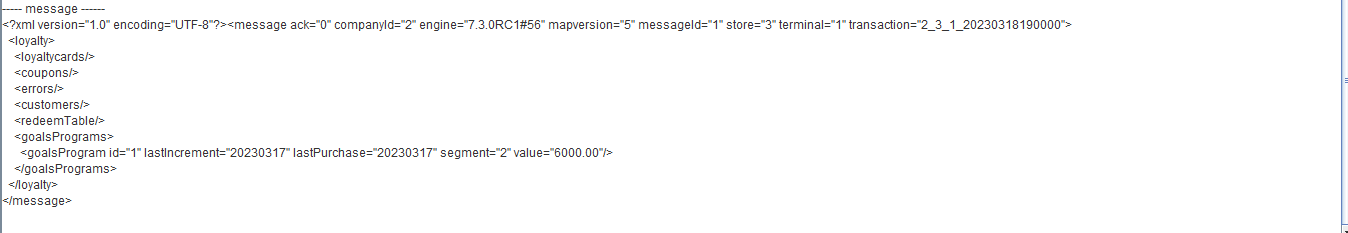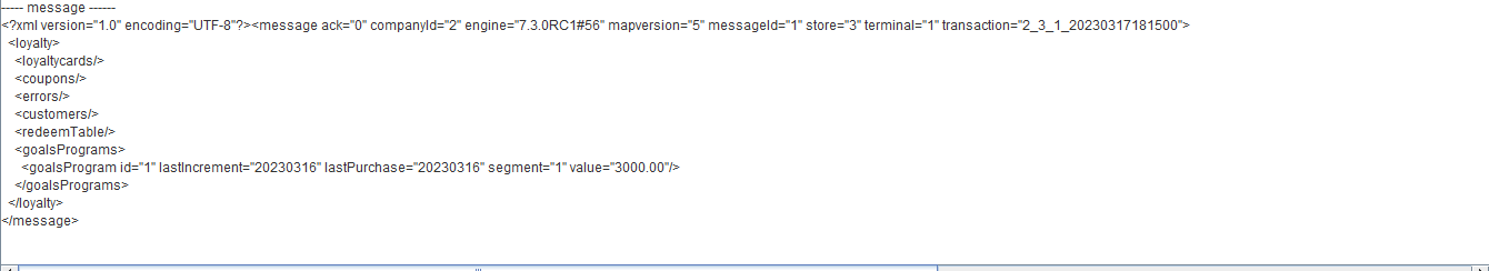 ---- message ------ <?xml version="1.0" encoding="UTF-8"?><message ack="0" companyId="2" engine="7.3.0RC3#71" mapversion="66" messageId="1" store="3" terminal="1" transaction="2_3_1_20230701160000"> <loyalty> <loyaltycards> <loyaltycard ack="0" amount="4300.00" id="2010000014" seq="1" type="3"/> </loyaltycards> <coupons/> <errors/> <customers/> <redeemTable/> <goalsPrograms> <goalsProgram id="3" lastIncrement="20230629" lastPurchase="20230630" segment="9" value="2300.00"/> </goalsPrograms> </loyalty> </message>