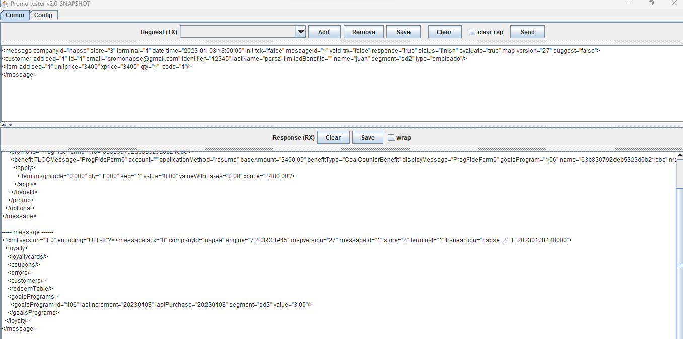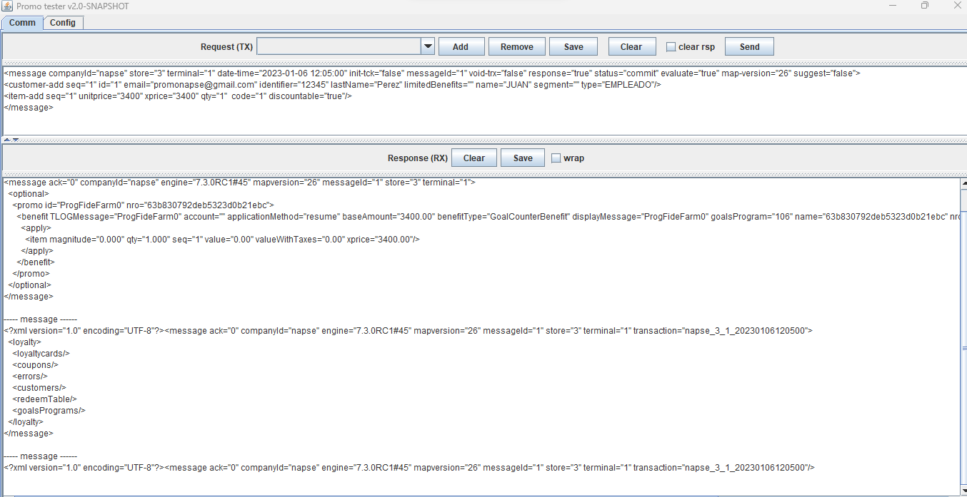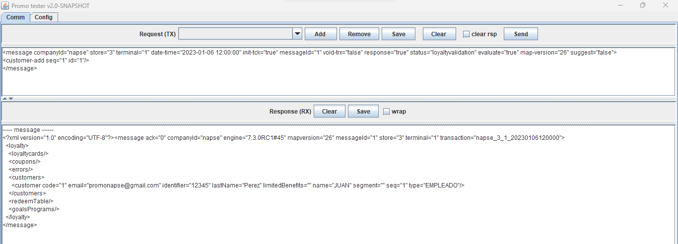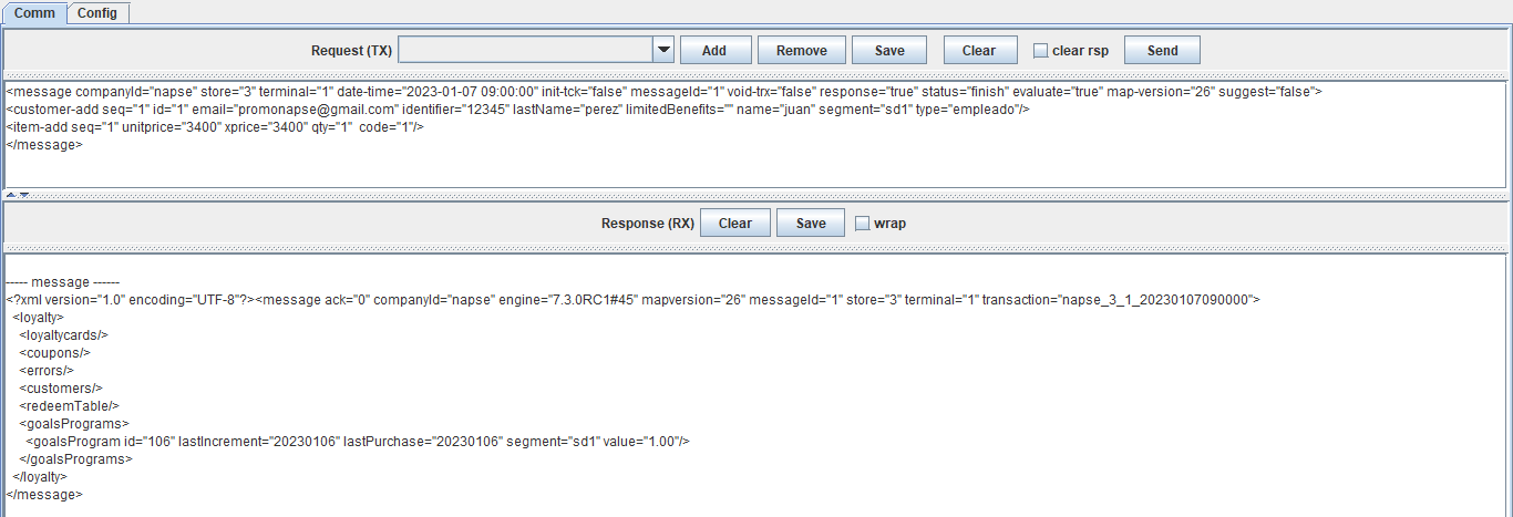 <message companyId="2" store="3" terminal="1" date-time="2023-07-04 11:05:00" init-tck="false" messageId="1" void-trx="false" response="true" status="sale" evaluate="true" suggest="false"> <loyaltycard-add seq="1" contract="" id="2010000014" type="3"/> <customer-add seq="1" id="6" age="0" birthday="false" code="6" email="[email protected]" identifier="444444" incompleteData="false" lastName="Maciel" limitedBenefits="" name="ANA" segment="11" type="EMPLEADO"/> <item-add seq="1" unitprice="500" xprice="500" qty="1" code="Servilletas"/> </message>