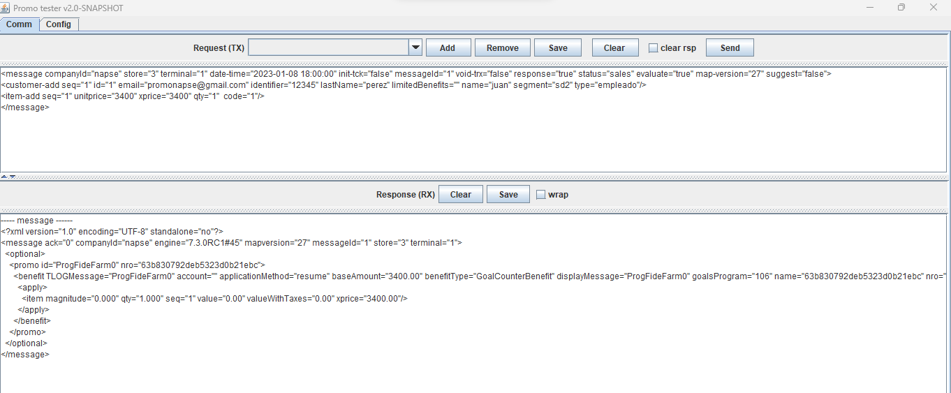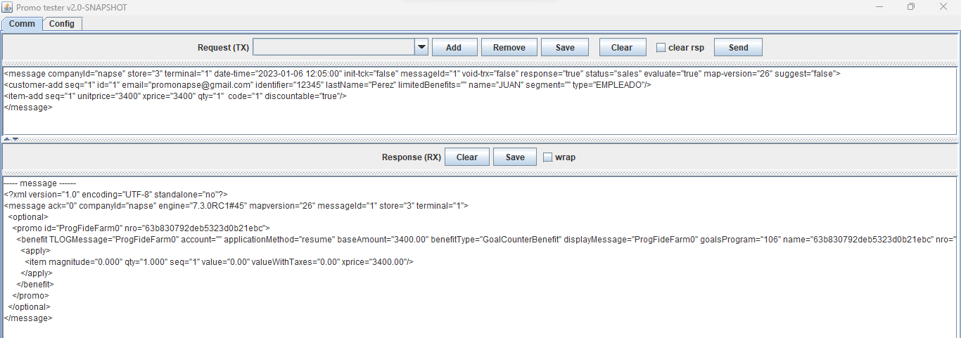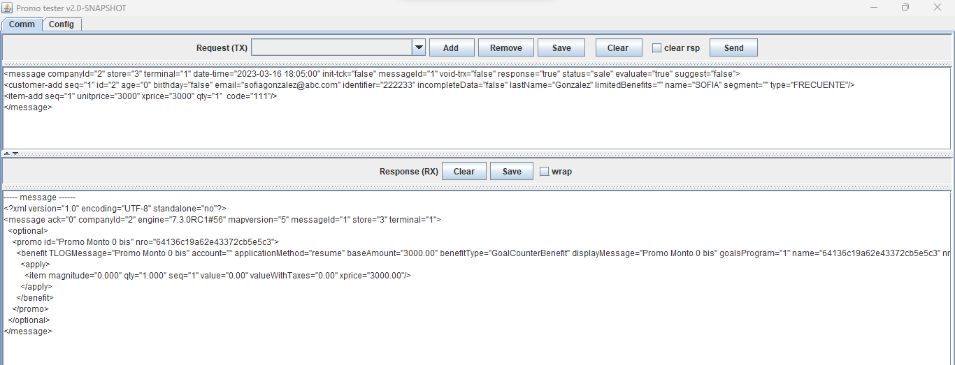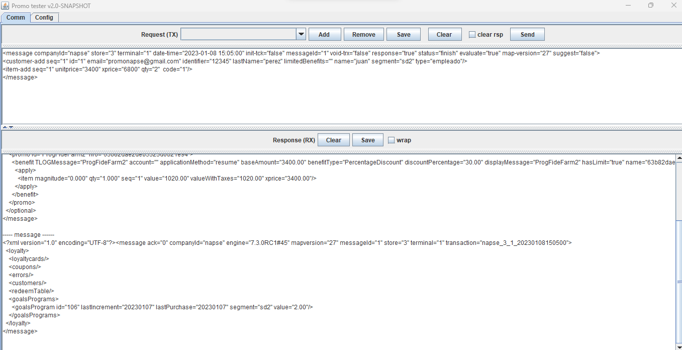 <message companyId="2" store="3" terminal="1" date-time="2023-07-04 11:05:00" init-tck="false" messageId="1" void-trx="false" response="true" status="sale" evaluate="true" suggest="false"> <loyaltycard-add seq="1" contract="" id="2010000014" type="3"/> <customer-add seq="1" id="6" age="0" birthday="false" code="6" email="[email protected]" identifier="444444" incompleteData="false" lastName="Maciel" limitedBenefits="" name="ANA" segment="11" type="EMPLEADO"/> <item-add seq="1" unitprice="500" xprice="500" qty="1" code="Servilletas"/> </message>