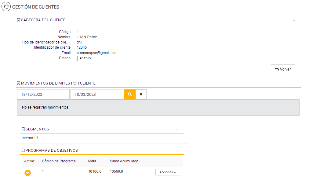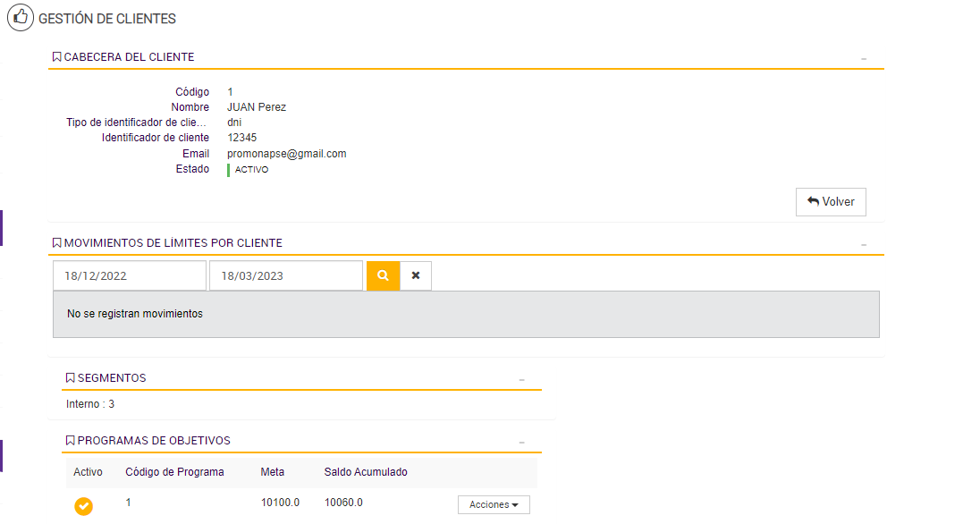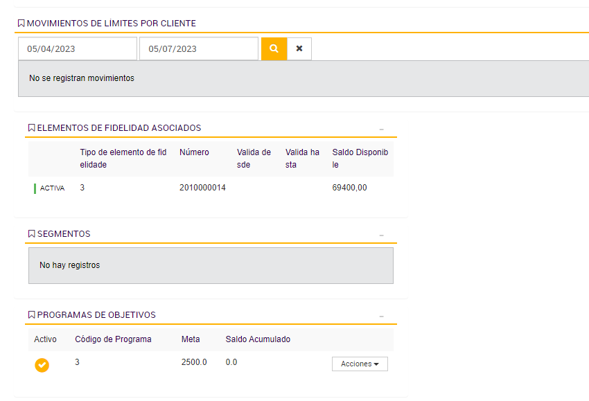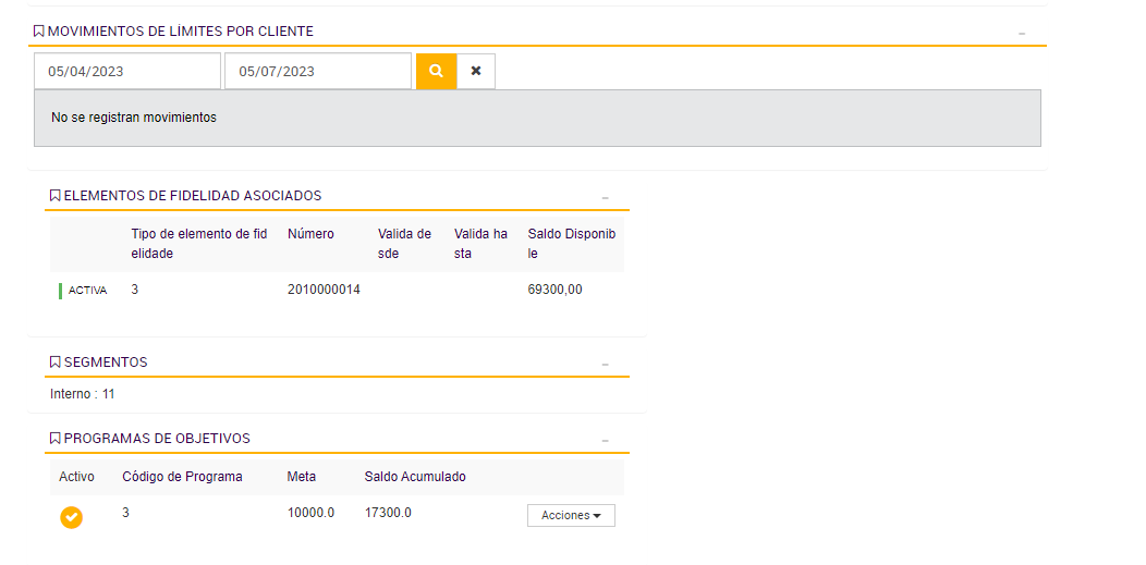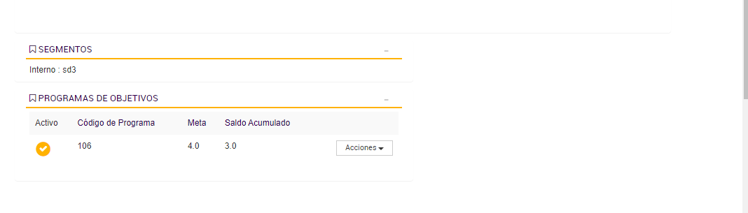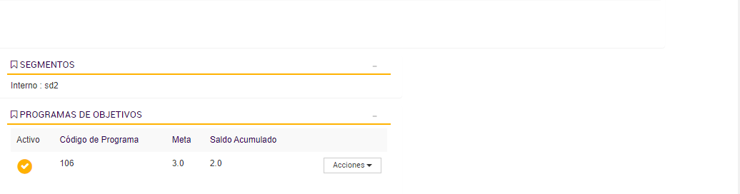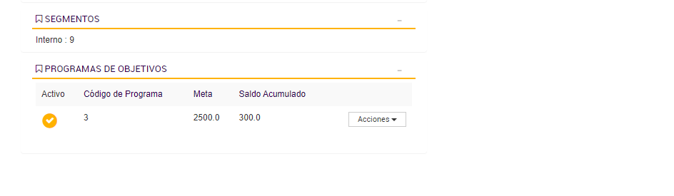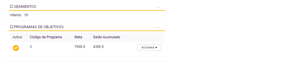 El Programa de Objetivos está diseñado para contabilizar las compras realizadas por cada cliente durante los períodos activos, acumulando los importes válidos en un contador asociado a su progreso. Esta lógica de acumulación permite determinar si el cliente avanza, se mantiene o desciende de segmento según su comportamiento de consumo.
