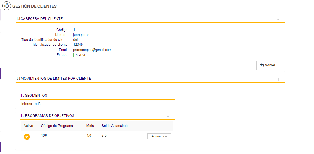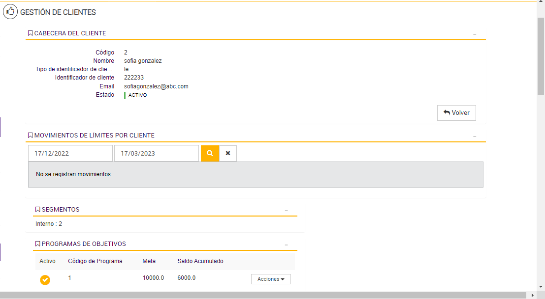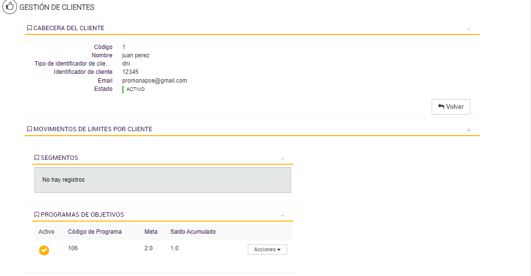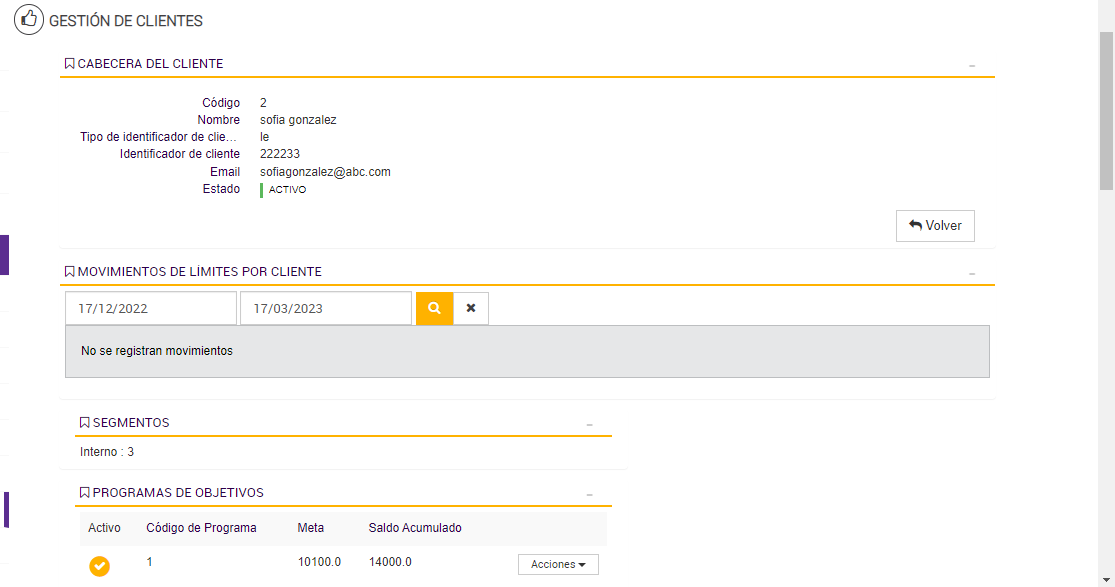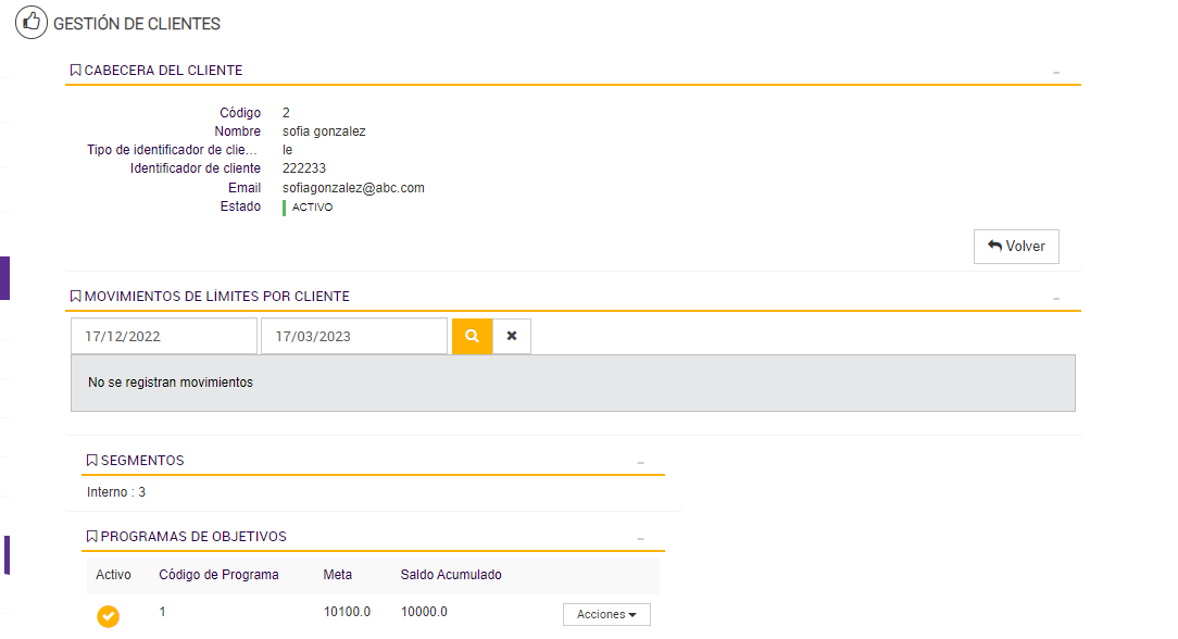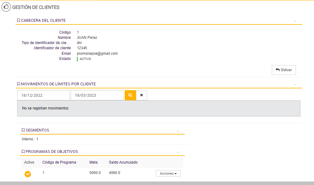 El Programa de Objetivos está diseñado para contabilizar las compras realizadas por cada cliente durante los períodos activos, acumulando los importes válidos en un contador asociado a su progreso. Esta lógica de acumulación permite determinar si el cliente avanza, se mantiene o desciende de segmento según su comportamiento de consumo.