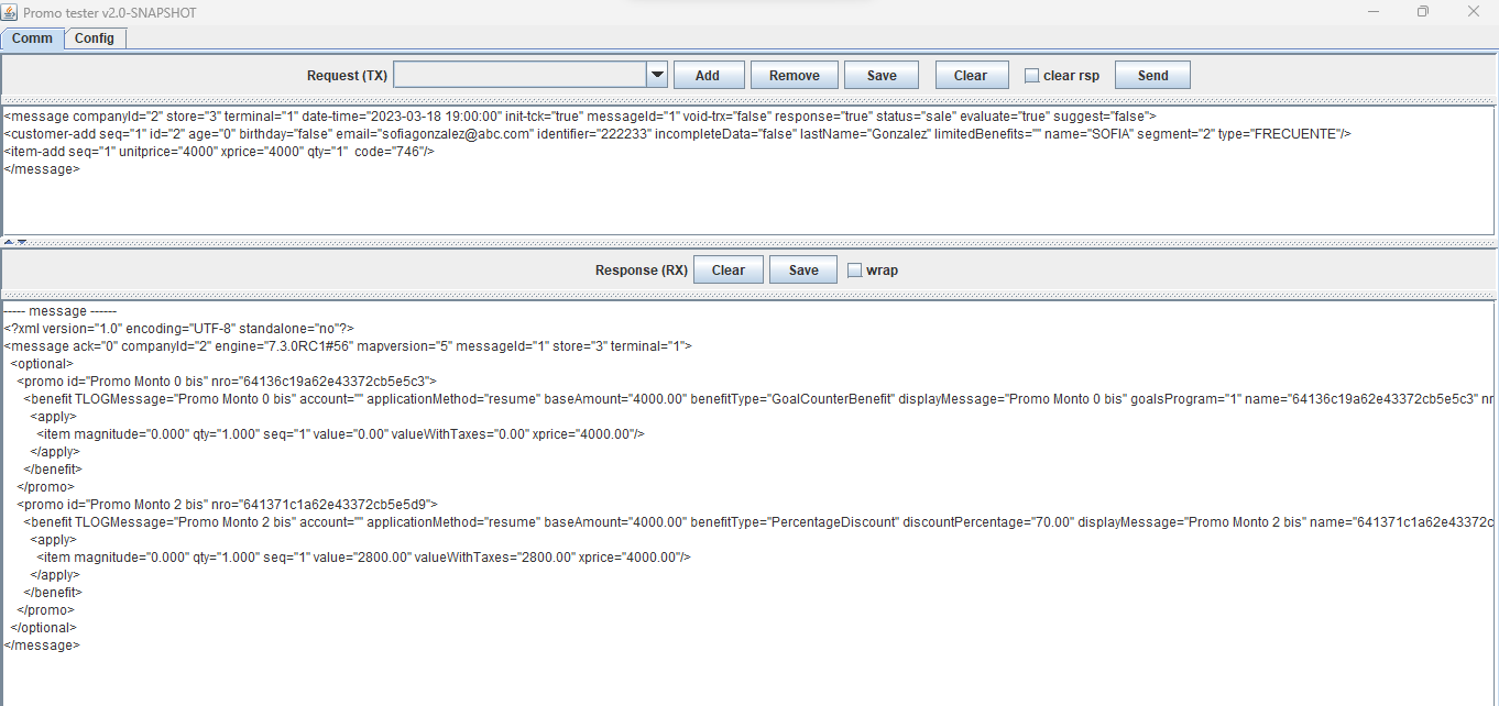 <message companyId="2" store="3" terminal="1" date-time="2023-07-03 11:05:00" init-tck="false" messageId="1" void-trx="false" response="true" status="sale" evaluate="true" suggest="false"> <loyaltycard-add seq="1" contract="" id="2010000014" type="3"/> <customer-add seq="1" id="6" age="0" birthday="false" code="6" email="[email protected]" identifier="444444" incompleteData="false" lastName="Maciel" limitedBenefits="" name="ANA" segment="10" type="EMPLEADO"/> <item-add seq="1" unitprice="400" xprice="8000" qty="20" code="Coca-Cola"/> <item-add seq="1" unitprice="100" xprice="20000" qty="20" code="Papas-Fritas"/> </message>