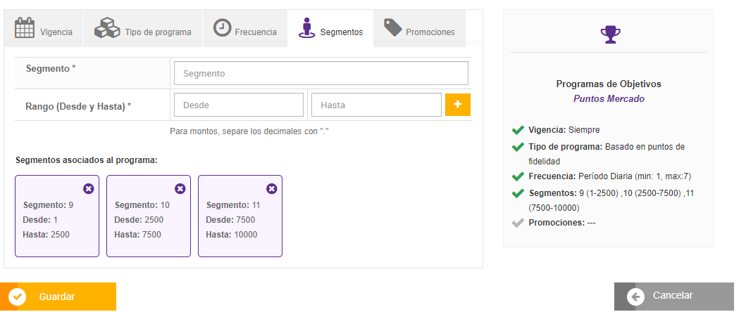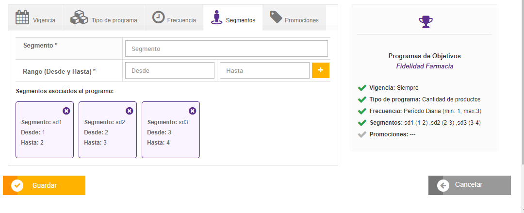 - Previo a iniciar la definición de programas de objetivos en la consola de Promo, deberán existir Segmentos registrados, para dicho programa.