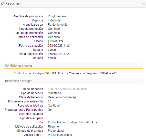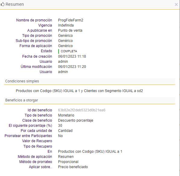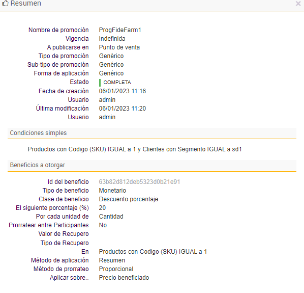 Se observa que además de la ProgFideFarm0, se le aplicó la promoción ProgFideFarm1, porque el cliente pertenece al segmento 1 y recibió un 20% de descuento en su compra.