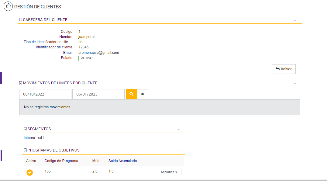 Al concluir el período de mayo, el sistema analiza el total de compras acumuladas por Javier y detecta que no alcanzó el objetivo correspondiente a su segmento actual. De acuerdo con la configuración del programa, debería ser reubicado en el Segmento 2, que exige un menor nivel de consumo.