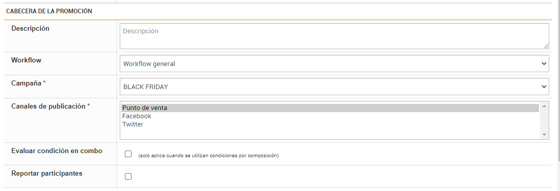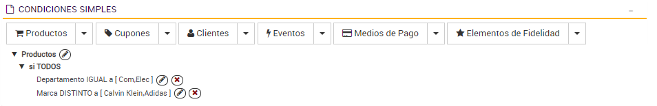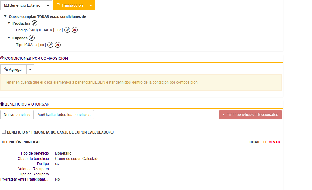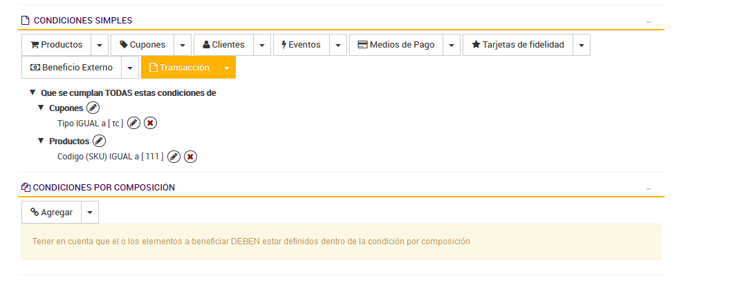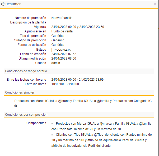 PROMO, a través de la Consola de Administración, permite definir promociones mediante combinación de componentes: condiciones simples, de rango horario, combos y beneficios.