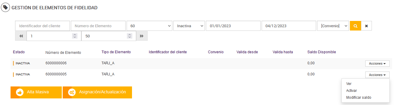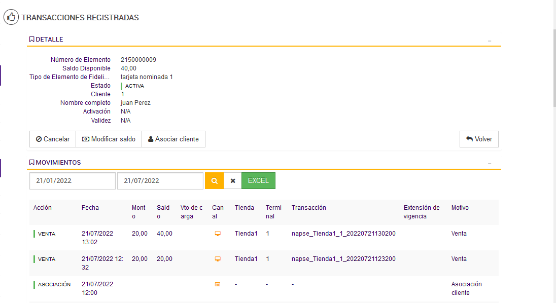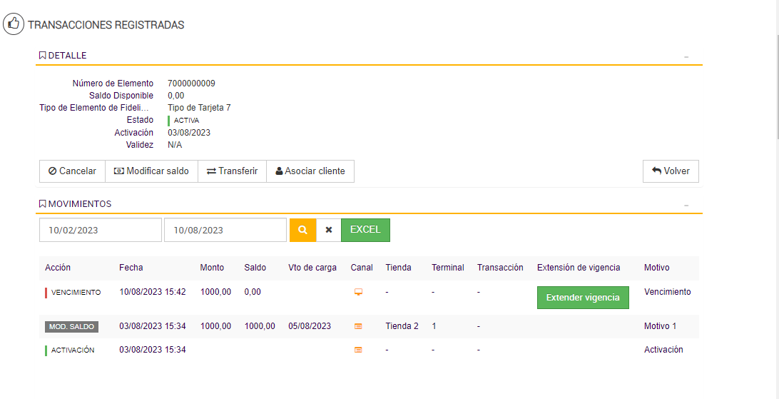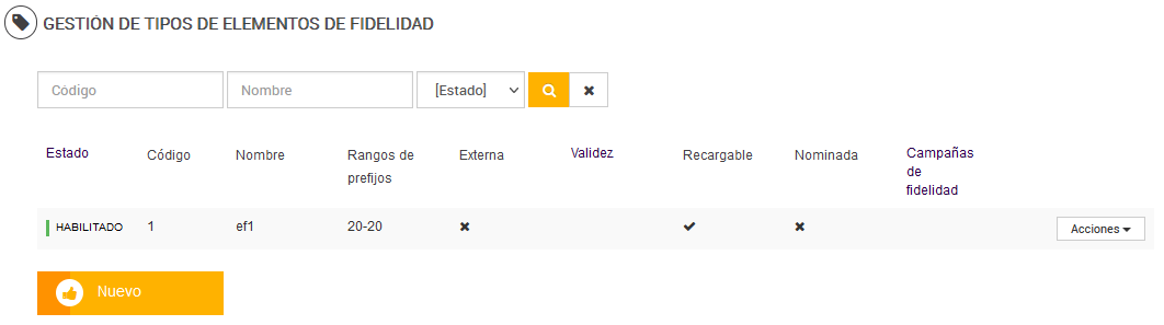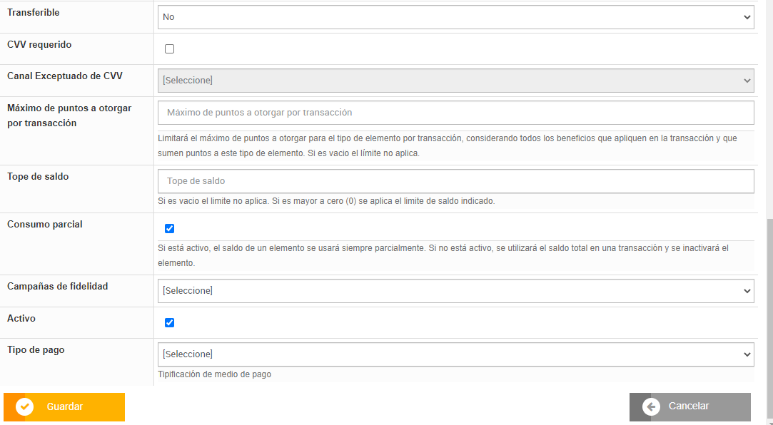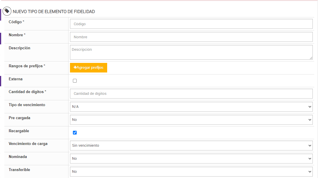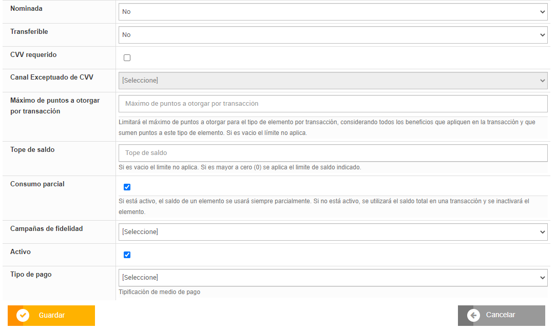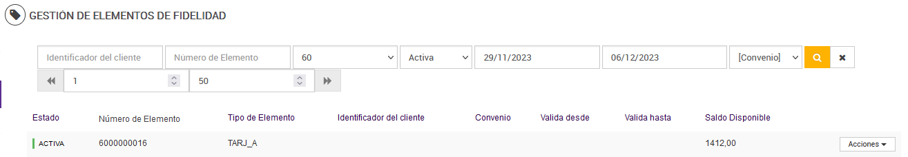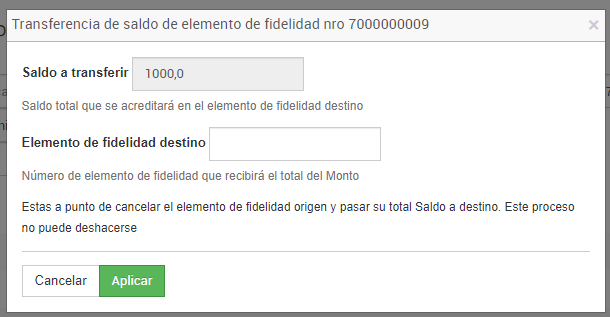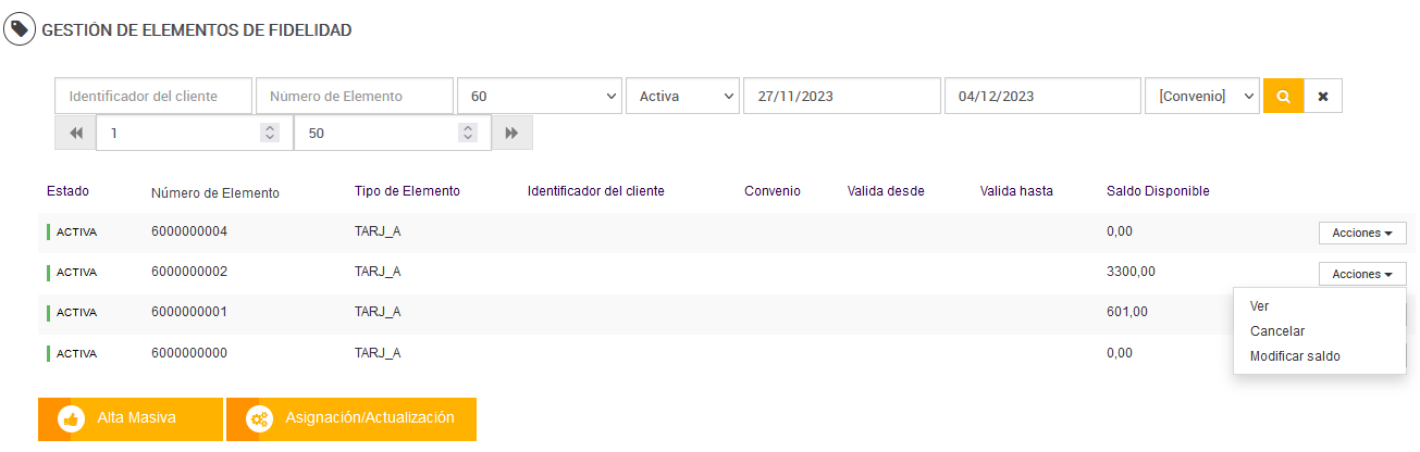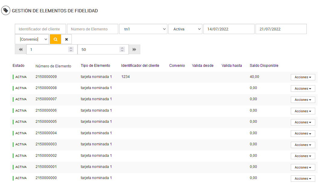 También es posible generar elementos de fidelidad, pudiéndose dar de altas distintos perfiles de elementos de fidelidad como ser por ejemplo, GiftCard, monederos o elementos de fidelidad de puntos, podrá gestionarse el saldo, asociarlas a y permitir su participación en promociones para incrementar o disminuir su saldo según la promoción que se aplique.