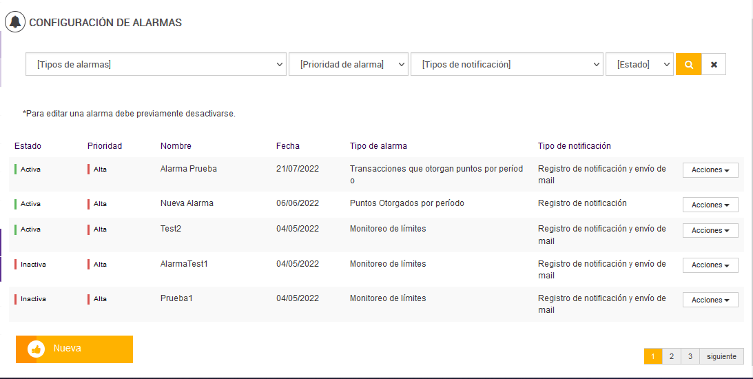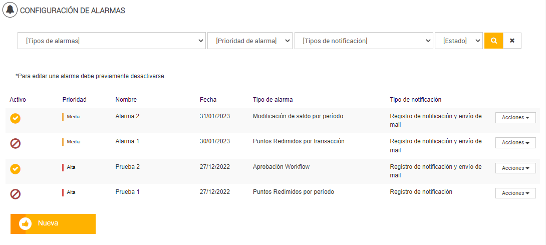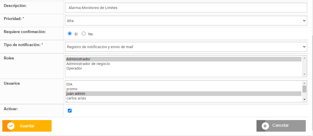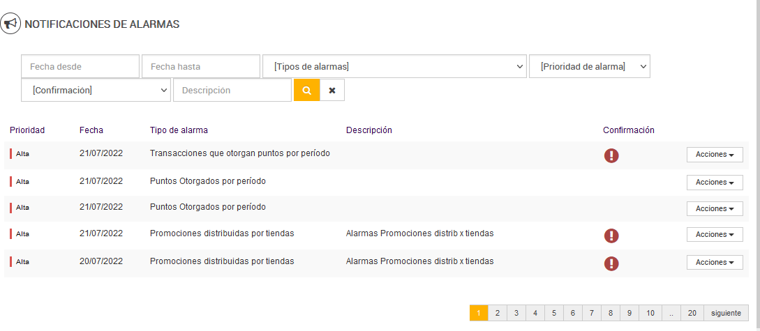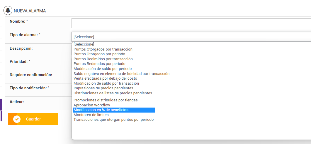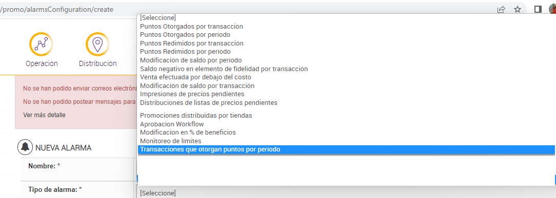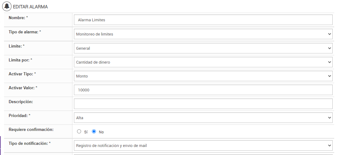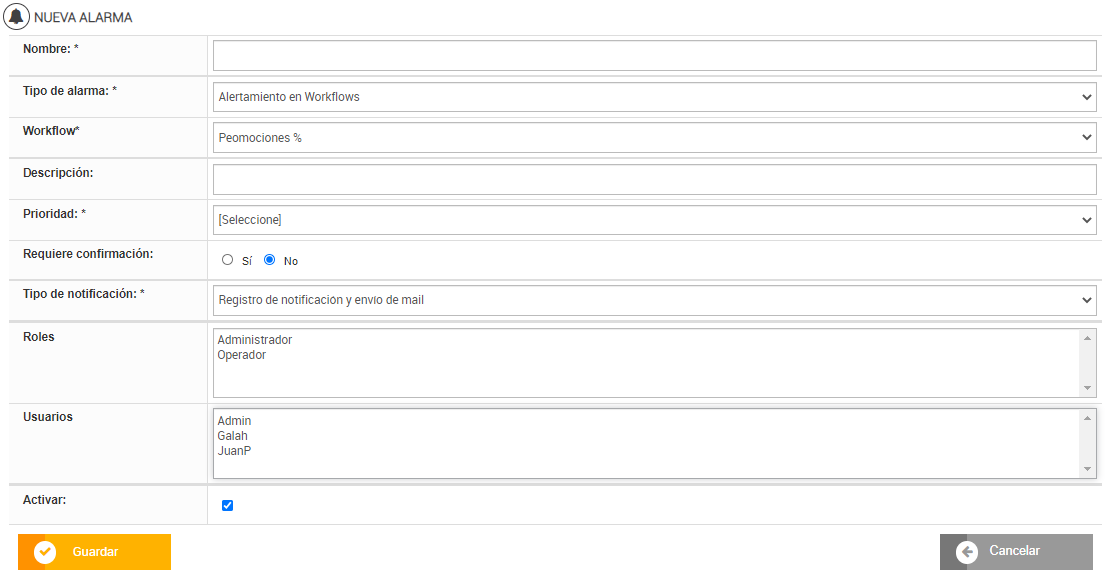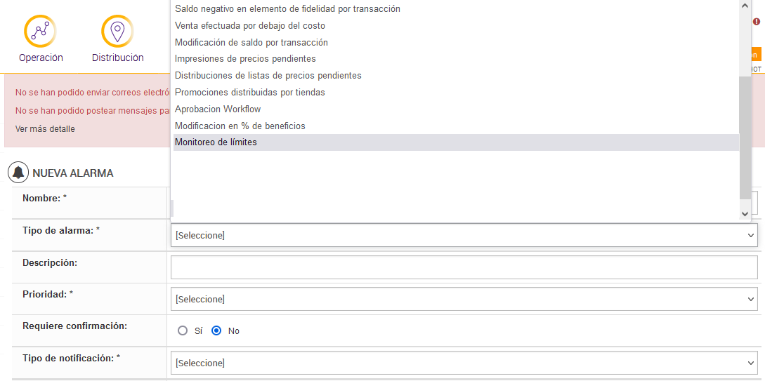 Con PROMO es posible gestionar alarmas, las cuales servirán para alertar a determinados usuarios sobre eventos relevantes que sucedan en la consola y/o transacción.