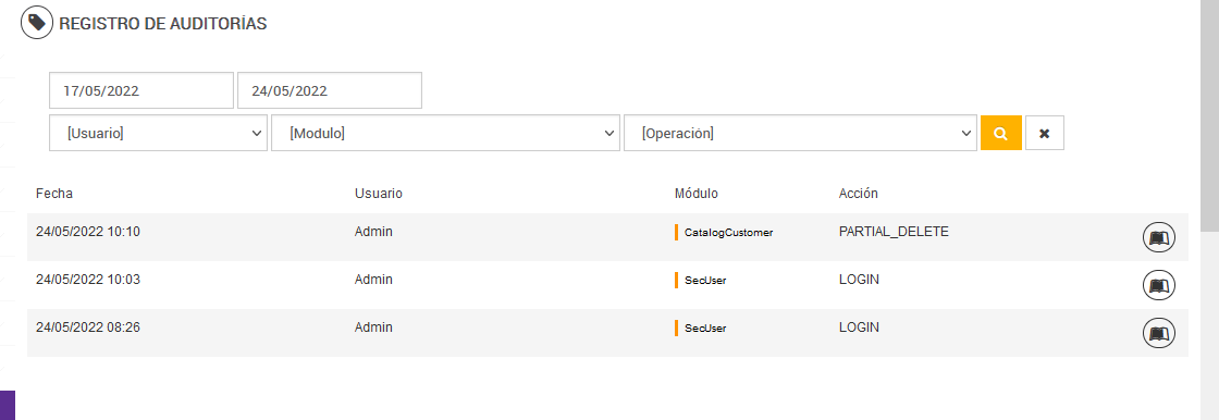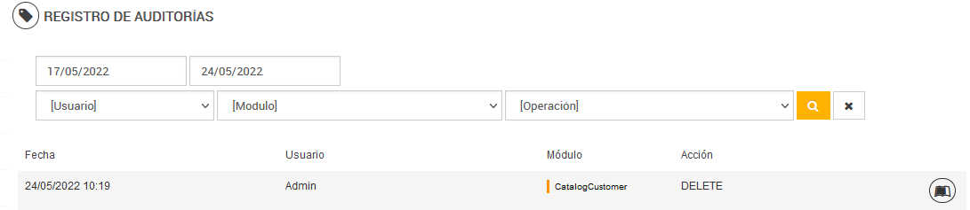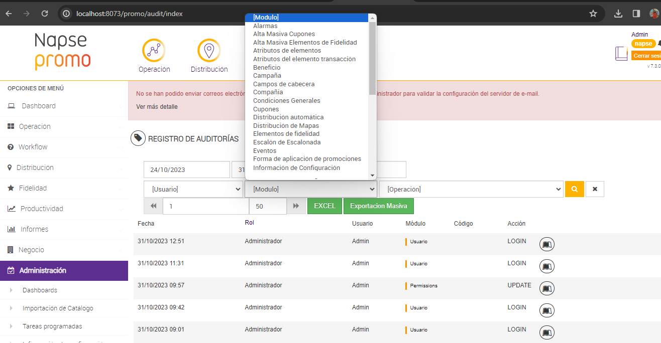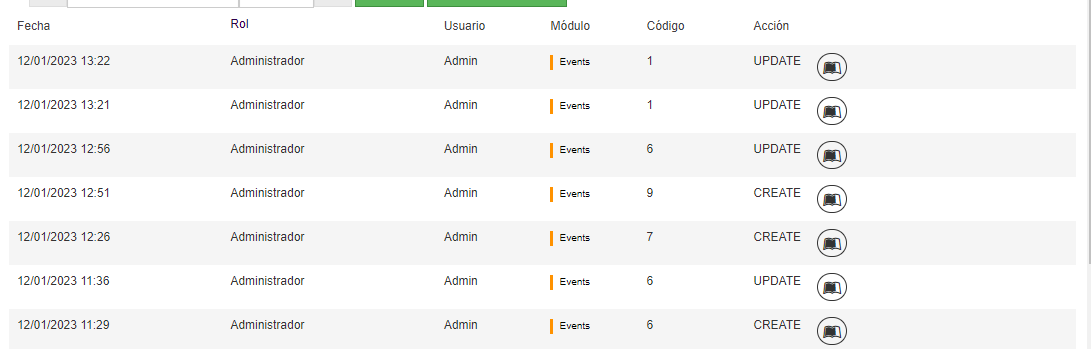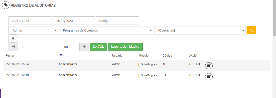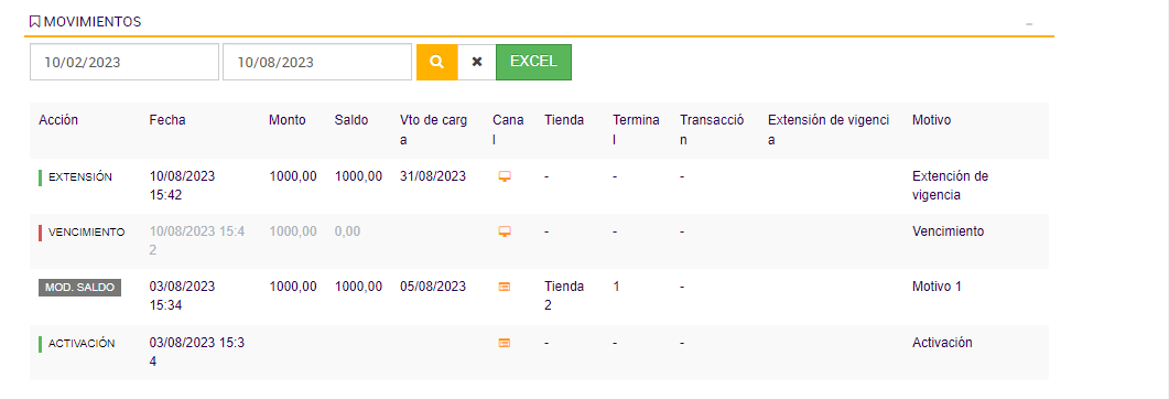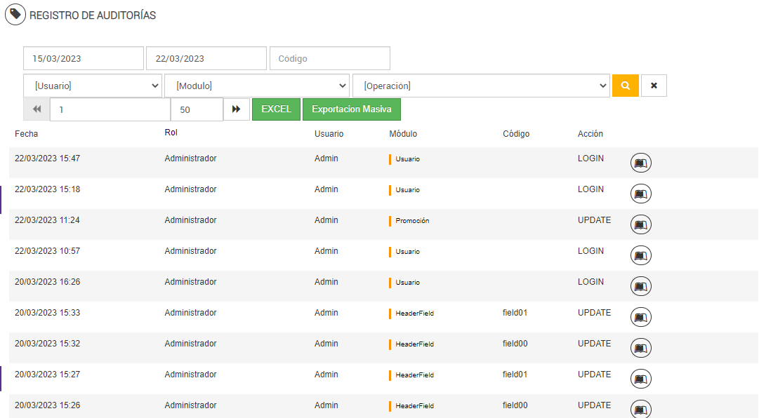 Si selecciona el botón "Excel" que se encuentra en la parte superior de la pantalla, descargará en un archivo Excel el listado de logs que muestra en pantalla, como se muestra a continuación: