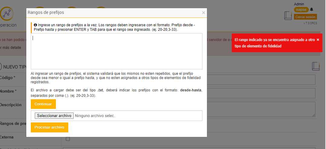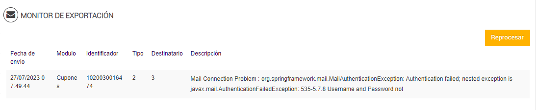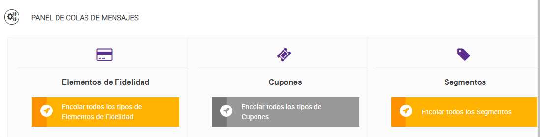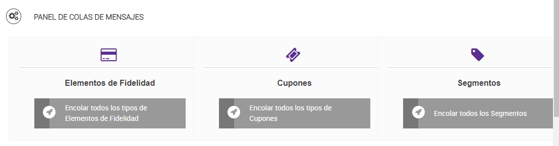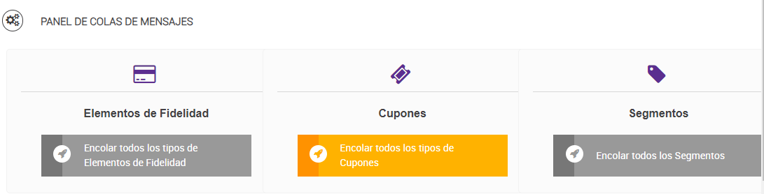 Permitirá enviar la información de tipos de Elementos de Fidelidad, tipos de Cupones, Segmentos y Transacciones, en caso de contingencia y que se desee enviar la información nuevamente, a la cola RabbitMQ, configurada para esta funcionalidad.