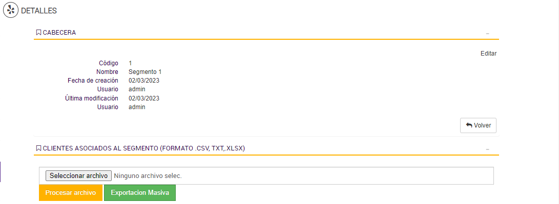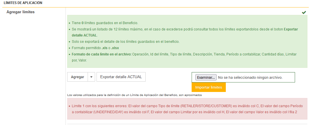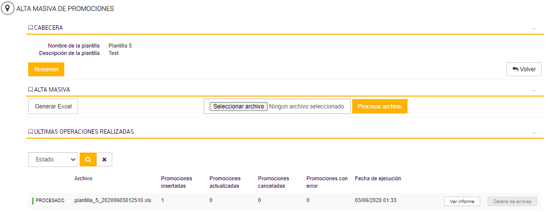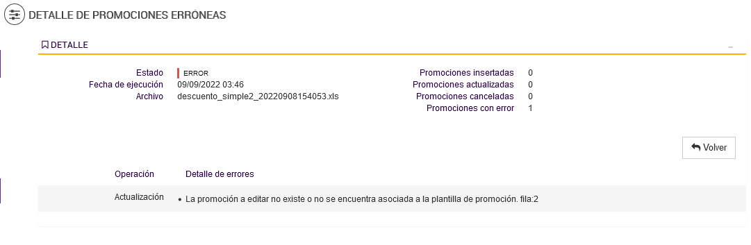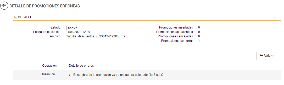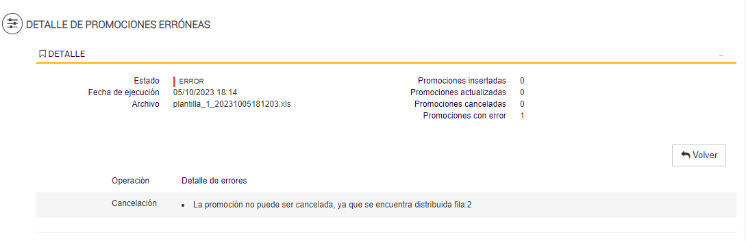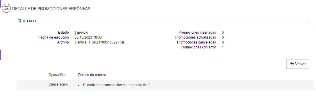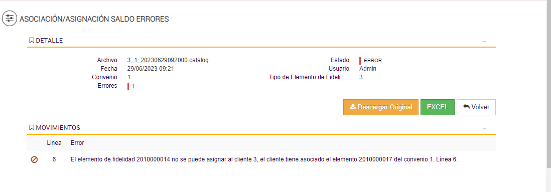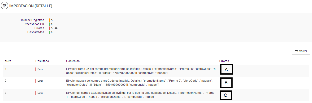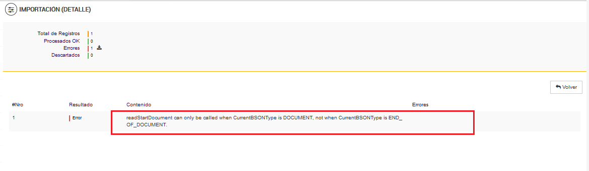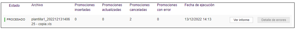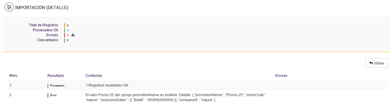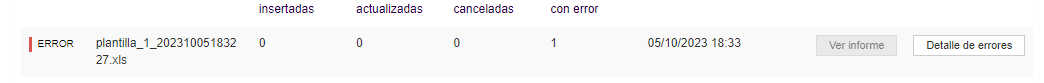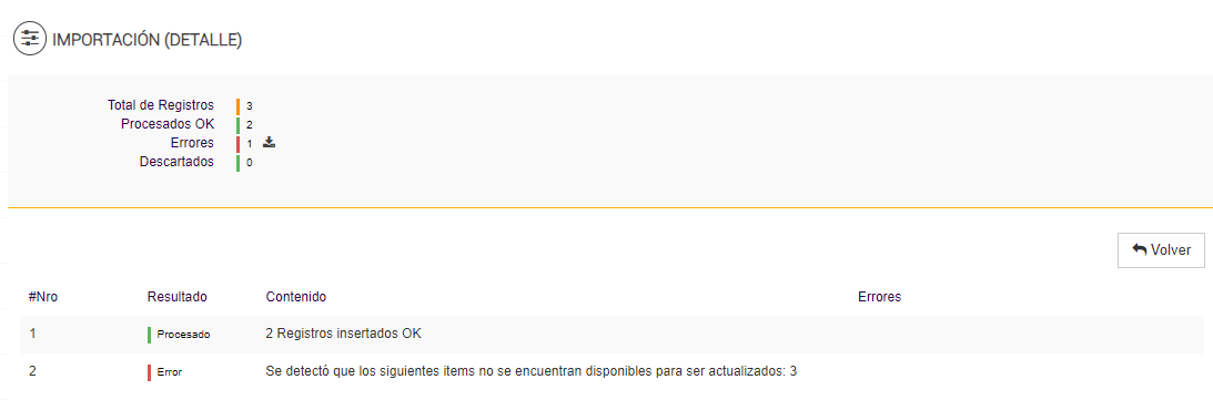 Si seleccionó la opción Acciones/ "Detalle”, podrá ver el detalle del resultado del proceso de importación: