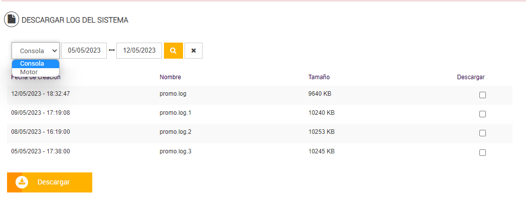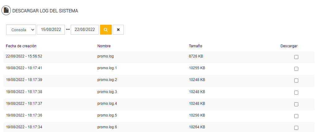 Al seleccionar la opción Descargar Logs, la aplicación desplegará en la vista Logs del sistema, los logs disponibles. A través de los checkBox debe seleccionar los que desea bajar y presionando el botón descargar, en el archivo correspondiente se obtendrá el archivo .zip. con los logs indicados.