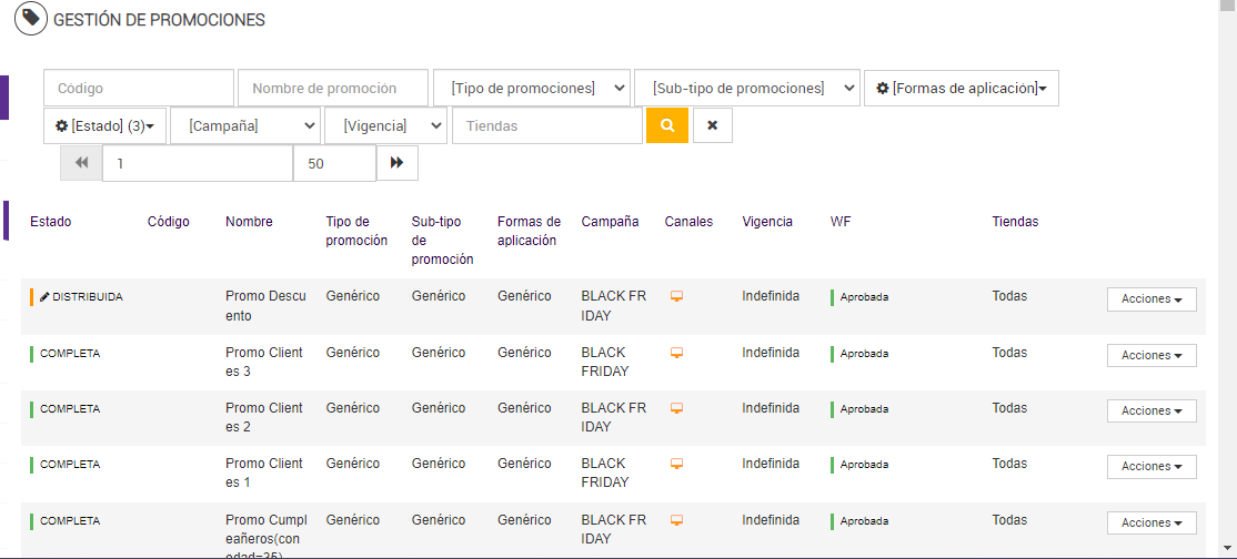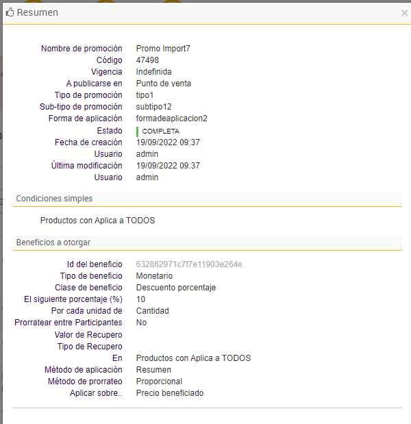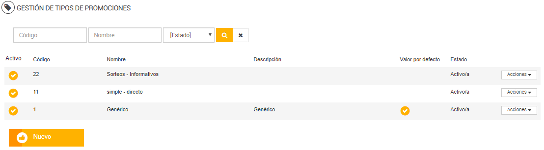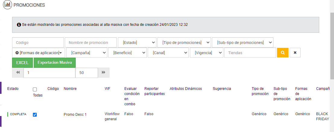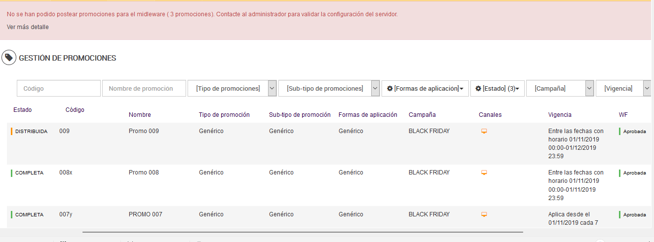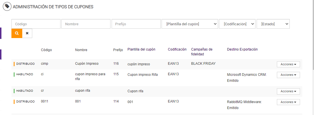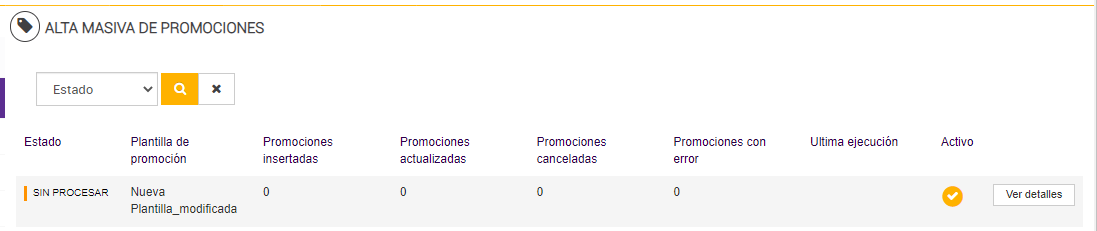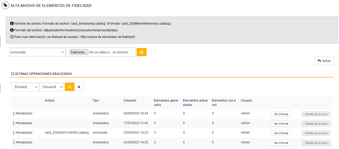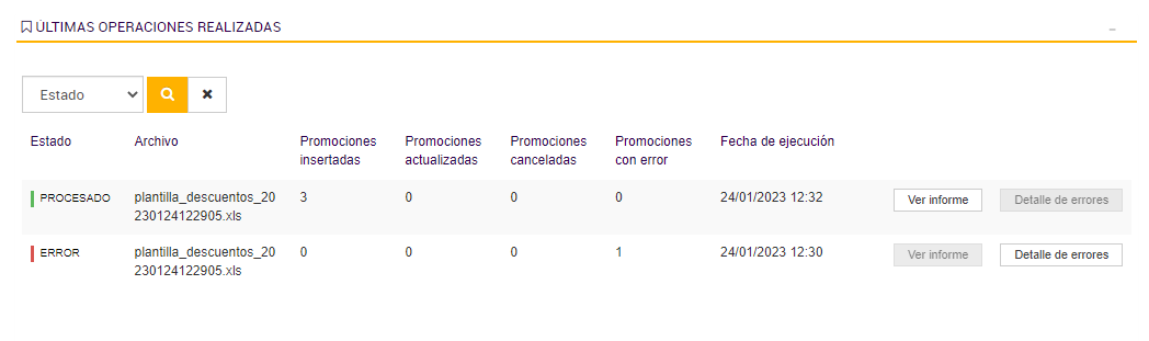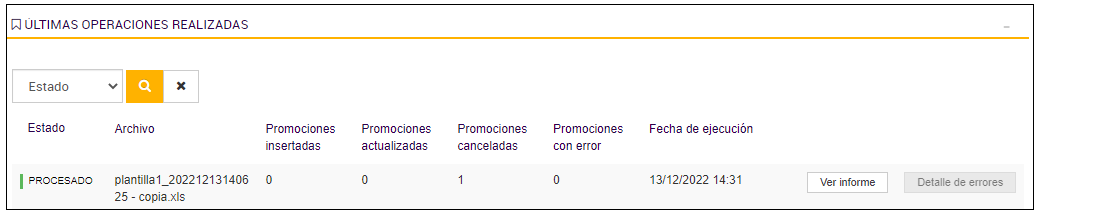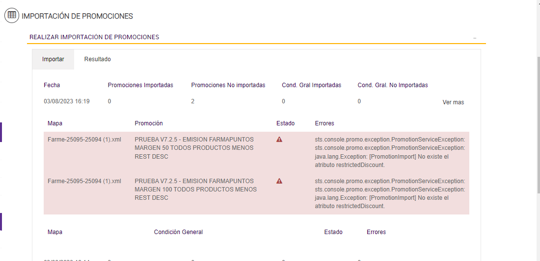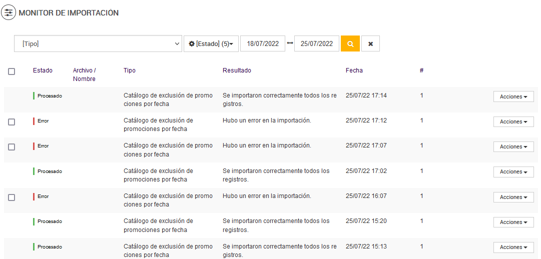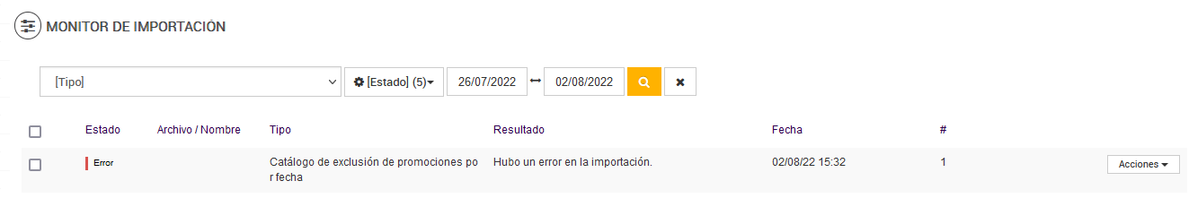 - Tipo: Indica los procesos de importación que se han ejecutado por los diferentes medios existentes: Catalogos/Rest/RabbitMQ/Importacion de Promociones Masivas vía Rest. No es una lista pre definida, dependerá de los tipos de importación realizados.