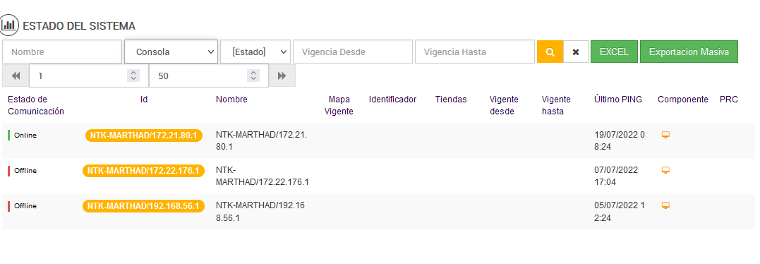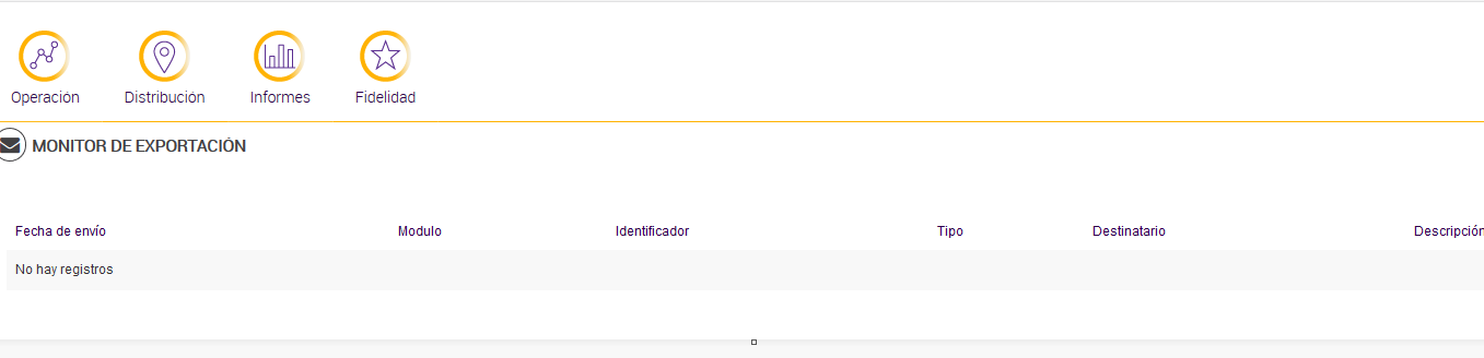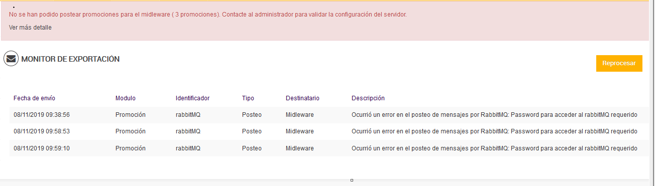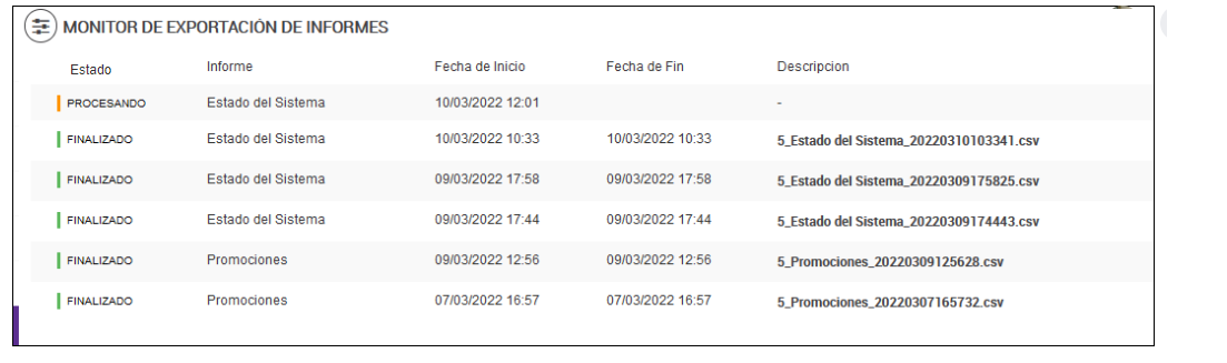 En esta sección se podrá visualizar el estado de las importaciones y exportaciones de archivos realizados vía Colas RabbitMQ que se tengan configuradas en la consola de Promo.