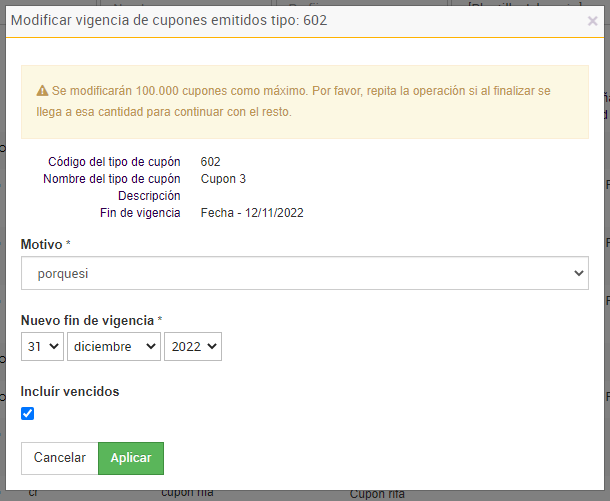 Luego de seleccionar el rango de fechas y hora que contega a la transacción que se desea reenviar presionar el botón "Aplicar". De esa forma se volverá a enviar todas las transacciones contentidas dentro de ese rango de fechas indicado.