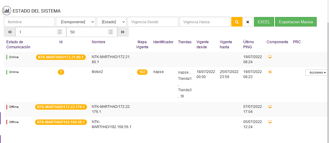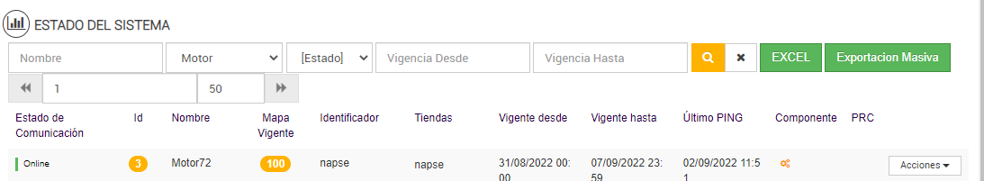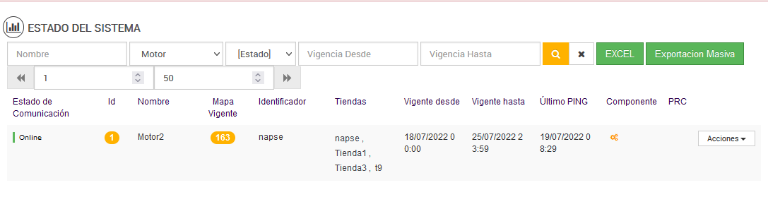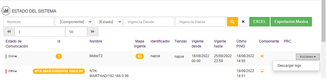 Si selecciona el botón Acciones podrá descargar los logs de los motores.