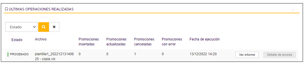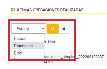 Si algún elemento se encuentra CON ERROR, y alguno se encuentra OK, el resultado del archivo aparecerá como “PARCIAL”, y si todos los elementos se procesaron con error, el resultad del archivo será “ERROR”, y mostrará "PROCESADO" cuando todos los elementos del archivo se hayan procesado correctamente.
