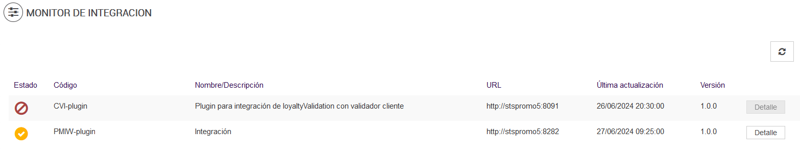 Cada plugin mostrará a la derecha la acción de "Detalle". Si el plugin se encuentra activo, el botón estará habilitado. (Por configuración de Visualización del Detalle del plugin consultar el Manual de Instalación de Promo: Información de Configuración\ Parámetros de Configuración de ambiente).