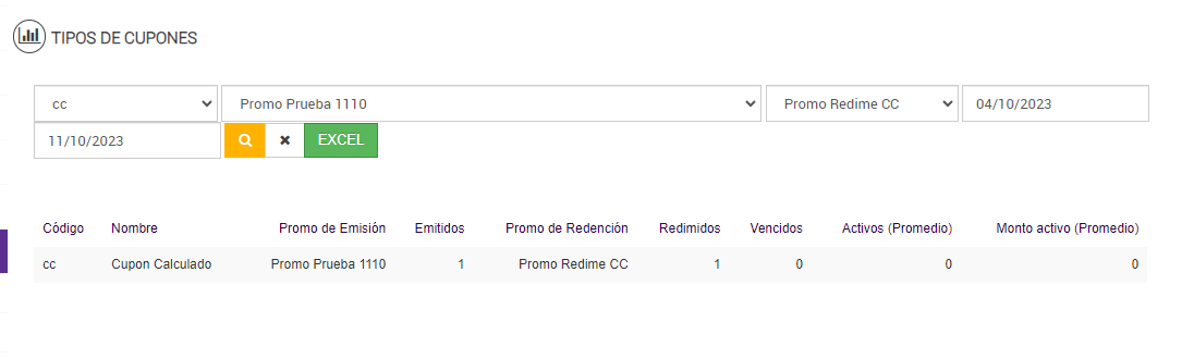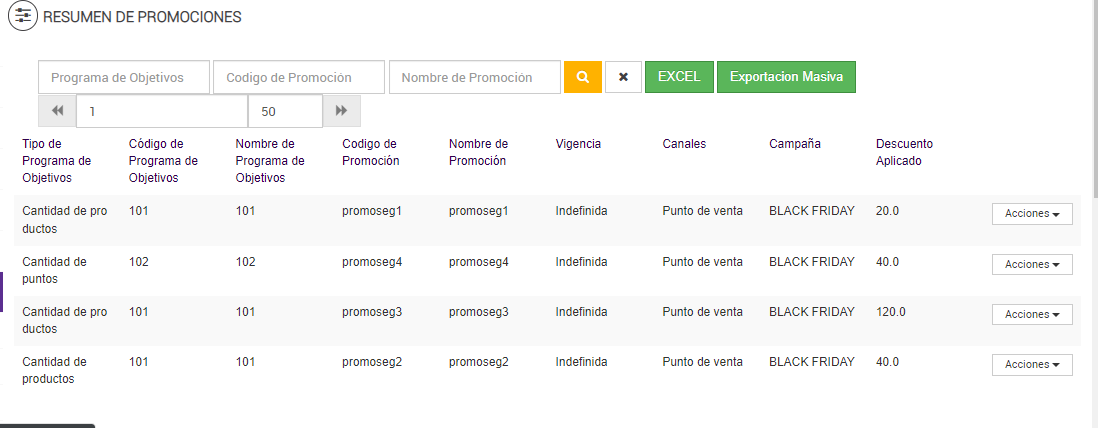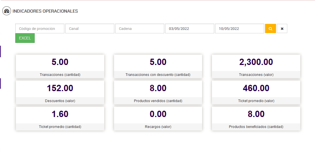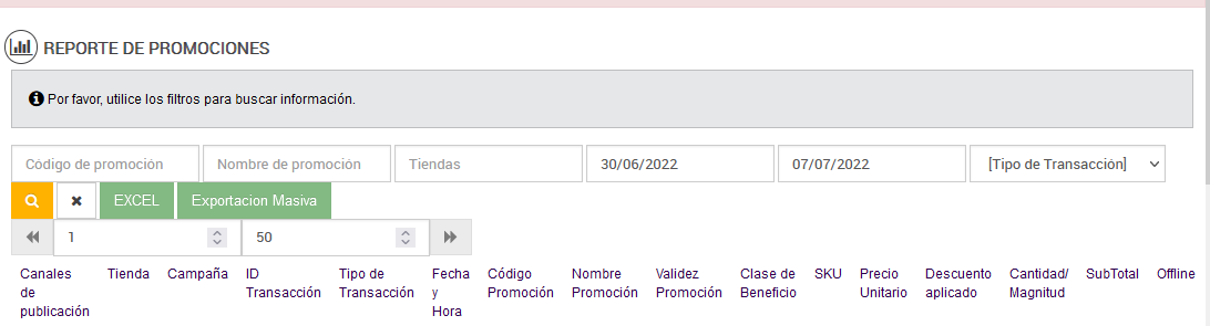 Esta opción permite filtrar y obtener informes de las promociones creadas, con la opción de exportar la información a un archivo .xls.