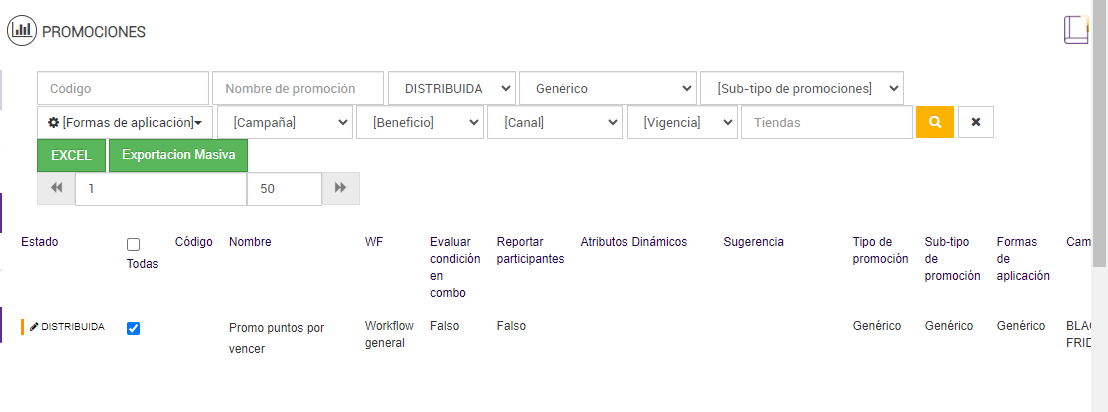Al tildar una o más promociones, y presionar el botón "Excel" solo se descargarán en el archivo las promociones seleccionadas.