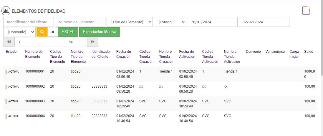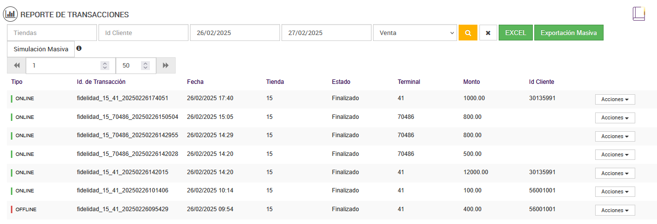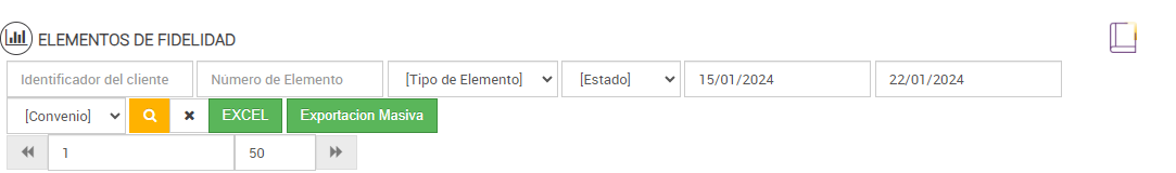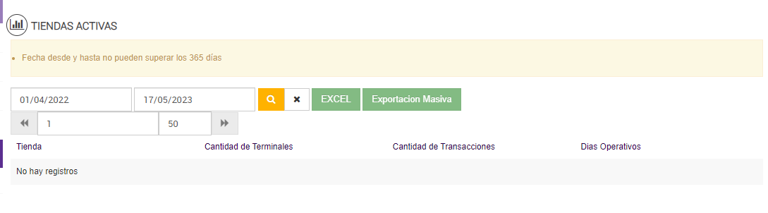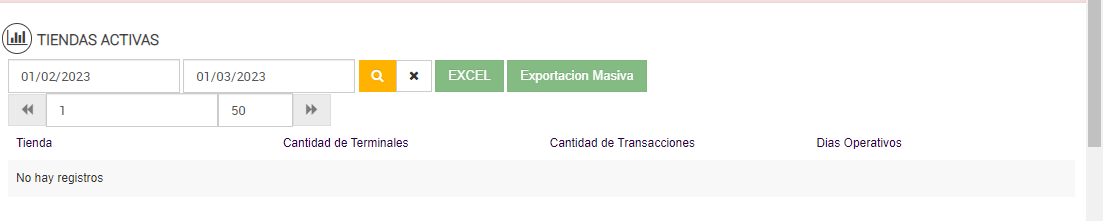 También posee las opciones de navegación, exportar a Excel (sólo los datos de pantalla) y Exportación Masiva (todos los datos existentes), detallados en Referencias Prácticas.