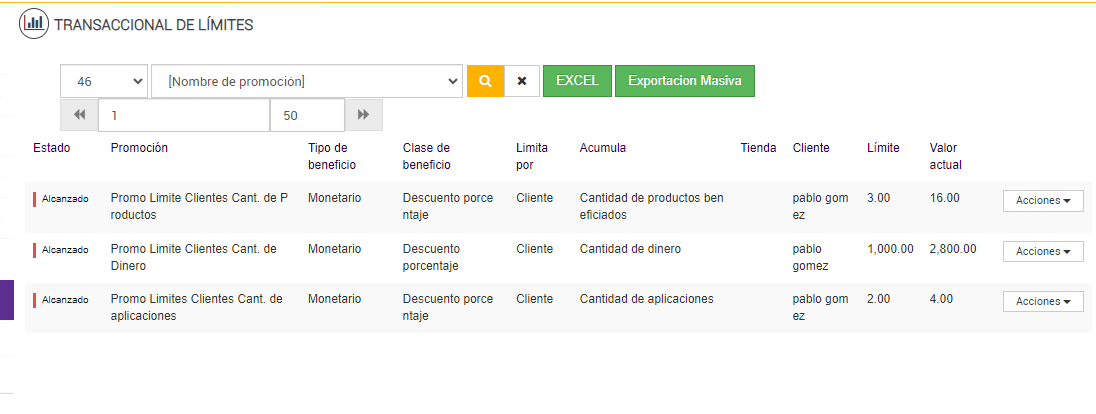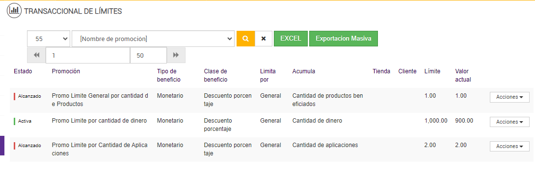 Esta opción permite filtrar y obtener informes de las promociones cuyos beneficios tienen definidos "Límites", con la opción de exportar la información a un archivo .xls.