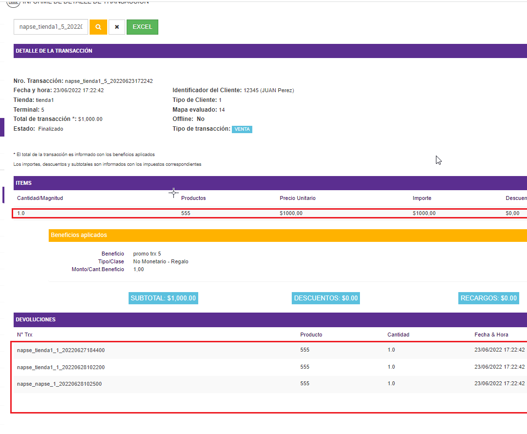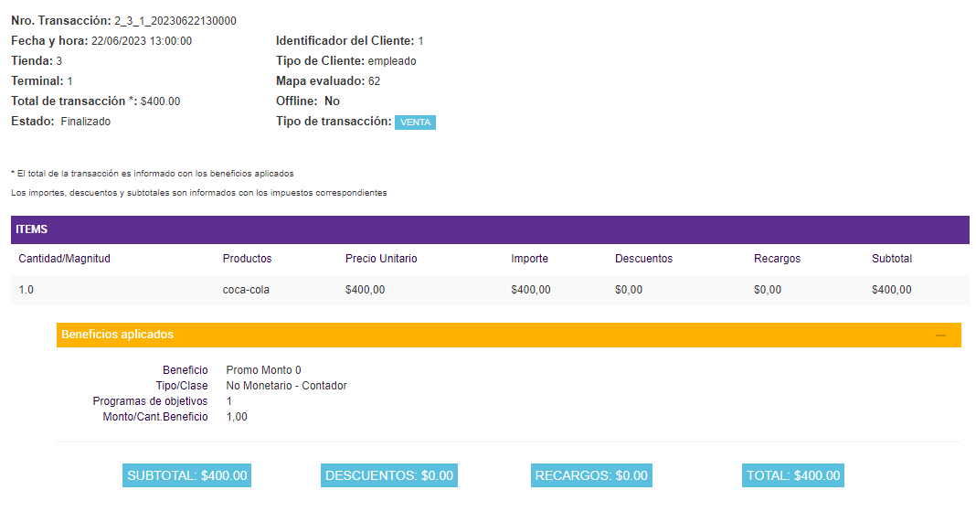 Mediante este informe, los usuarios pueden identificar qué productos fueron comprados o devueltos, en qué fechas, por qué canal (ej. POS), en qué cantidad, y cómo afectaron los acumulados del cliente. También permite auditar si un beneficio fue aplicado correctamente al cumplirse la condición del programa.