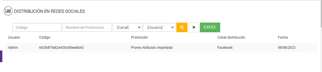 Esta opción permite filtrar y obtener informes de las promociones que fueron distribuidas en las distintas redes sociales, con la opción de exportar la información a un archivo .xls.