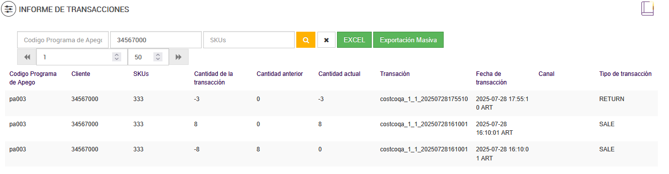 El Informe de Transacciones es una herramienta incluida en la sección Informes > Programa de Apego de la consola de PROMO, que permite consultar el detalle de cada operación que haya impactado en la acumulación de productos de un cliente dentro de un programa activo.
