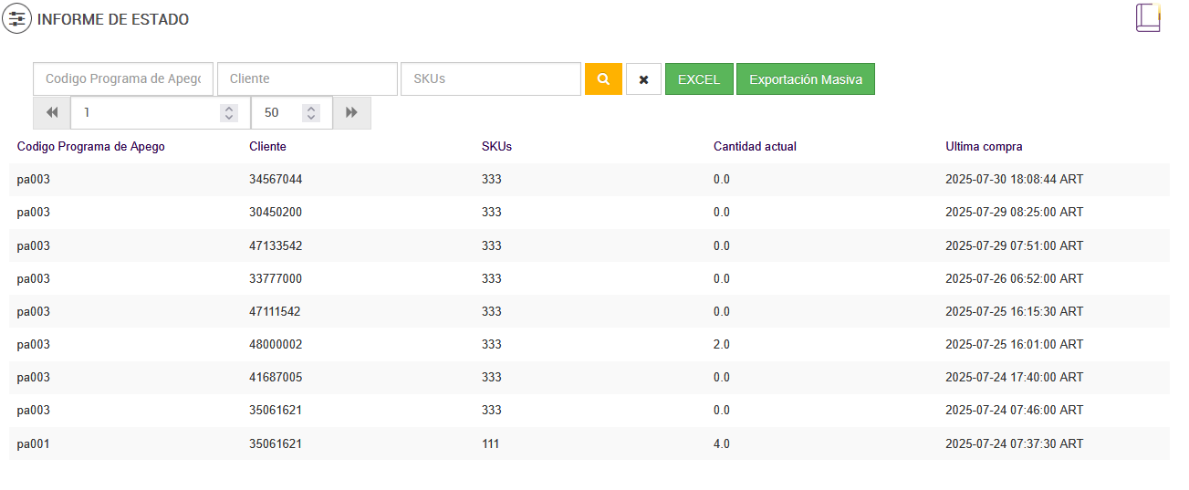 El Informe de Estado es una herramienta fundamental dentro de la sección Informes > Programa de Apego de la consola de PROMO. Su objetivo principal es brindar una visión actual y consolidada de los acumulados de un cliente para cada producto (SKU) involucrado en Programas de Apego activos.