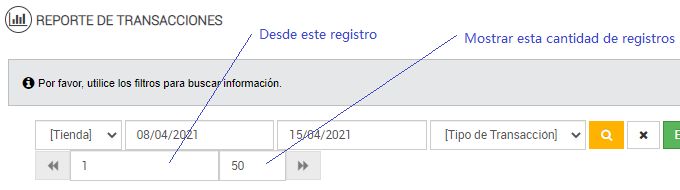 Debajo de los filtros de búsqueda se mostrarán dos campos para navegar los registros, son los filtros de paginación, que por default al ingresar al informe mostrarán 1 (uno) y 50 (cincuenta), de esta manera, mostrará por pantalla los primeros 50 registros partiendo del primer registro.